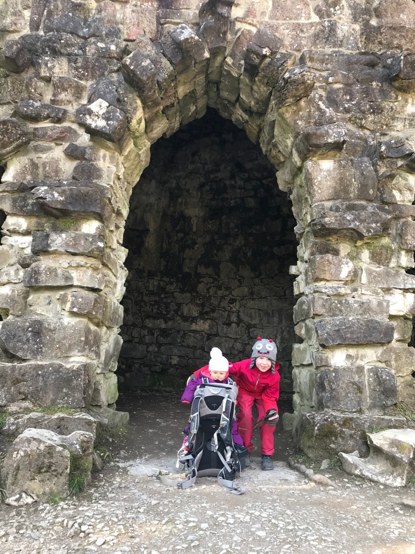 Walking up we passed this old building – don’t know what it was but it had a great doorway! Leo struggles to get down to Evie’s height!
