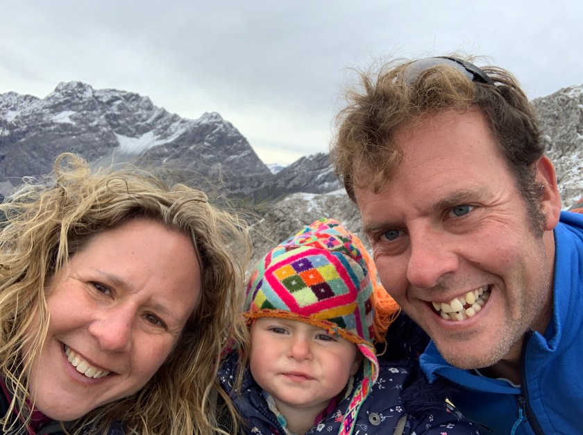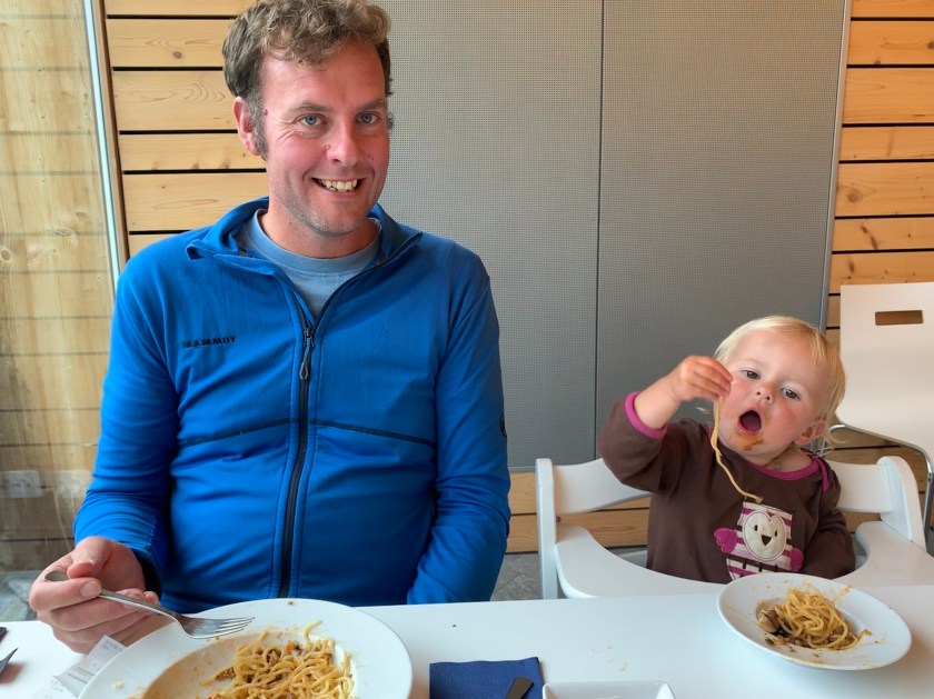 After a swim and a good breakfast, Evie experiences her first chair lift – she’s not too sure but not obviously scared either – just wondering how you move through the air above the trees.