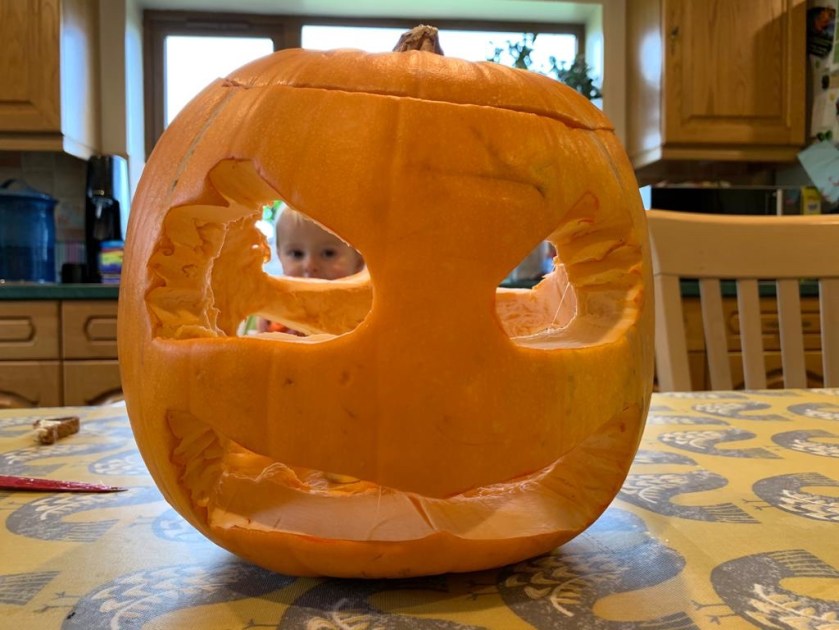 Evie peering through her pumpkin back home