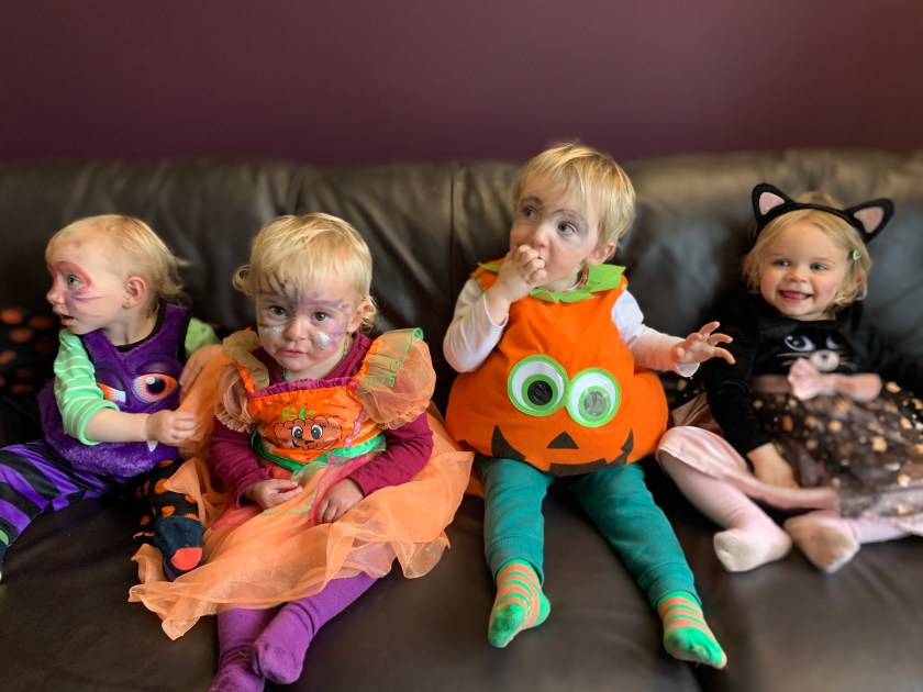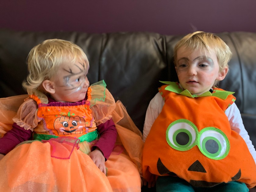 We are set to go in our outfits for the toddlers Halloween party. I take the face paints with me so we can have some fun!