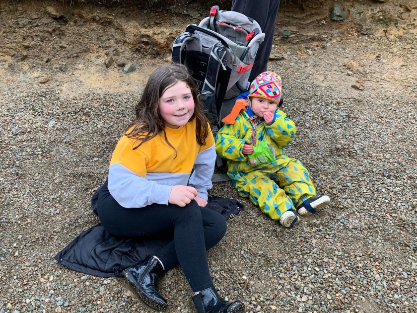 Sitting on the shores of small water with Rose enjoying a snack, whilst Jude runs to a patch of snow up high just to get a handful.