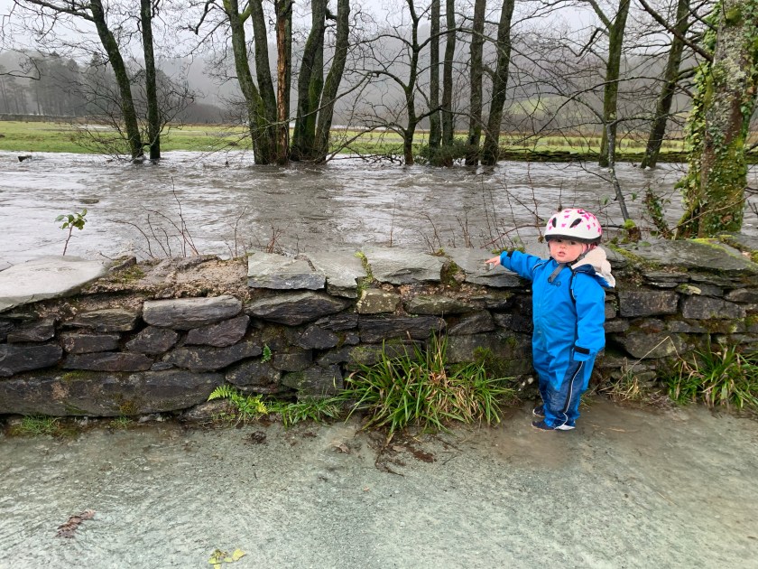 Evie is desperate to walk the walk – not this time little Bean. The river is rampaging on just the other side.