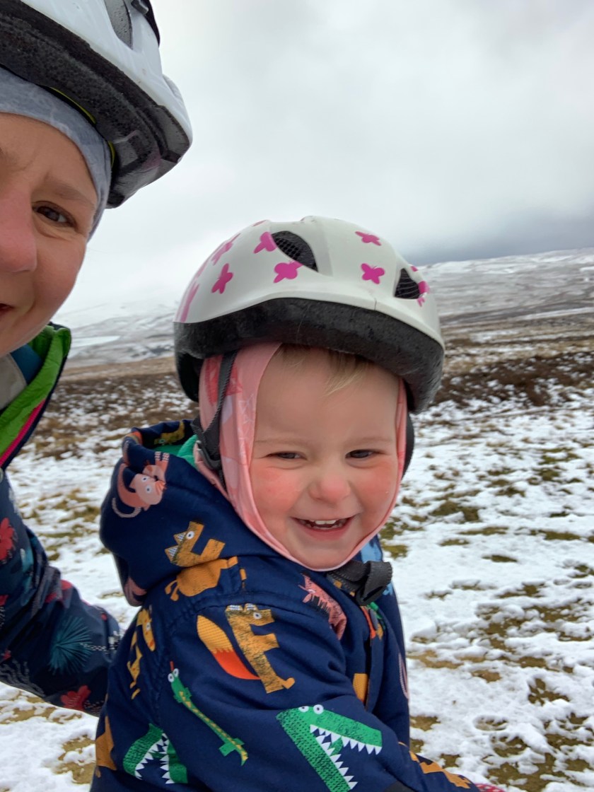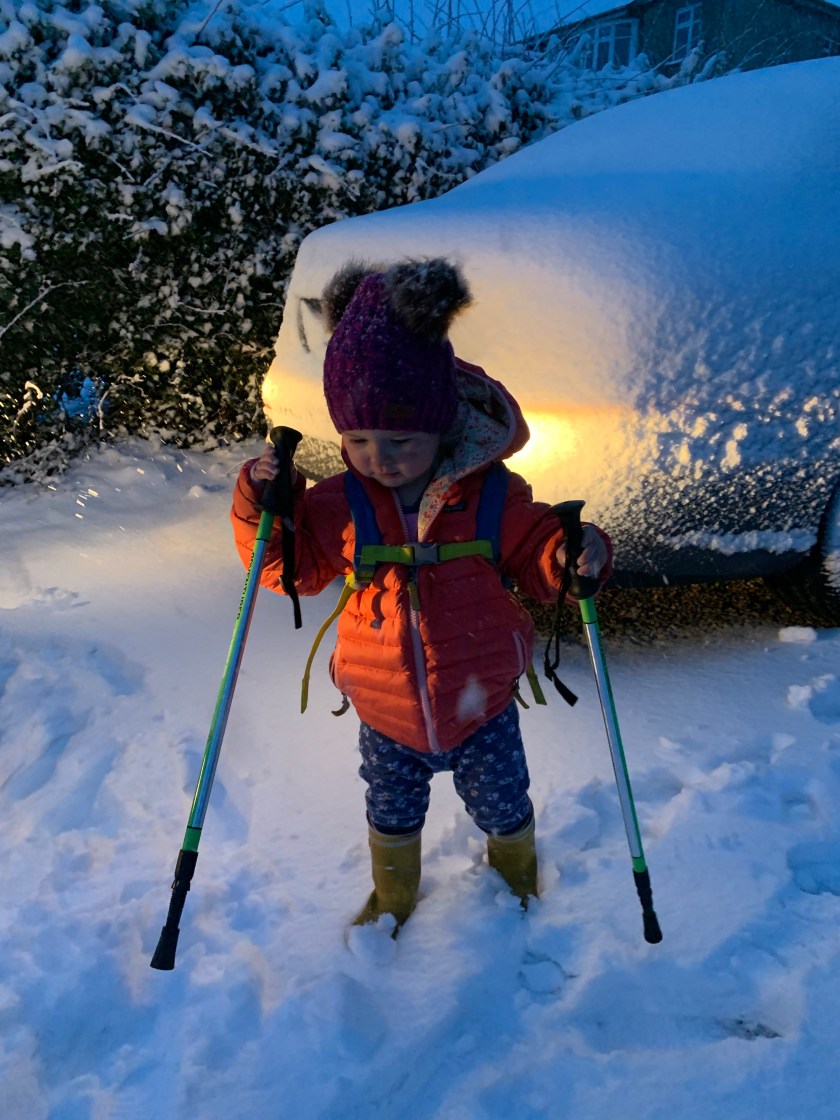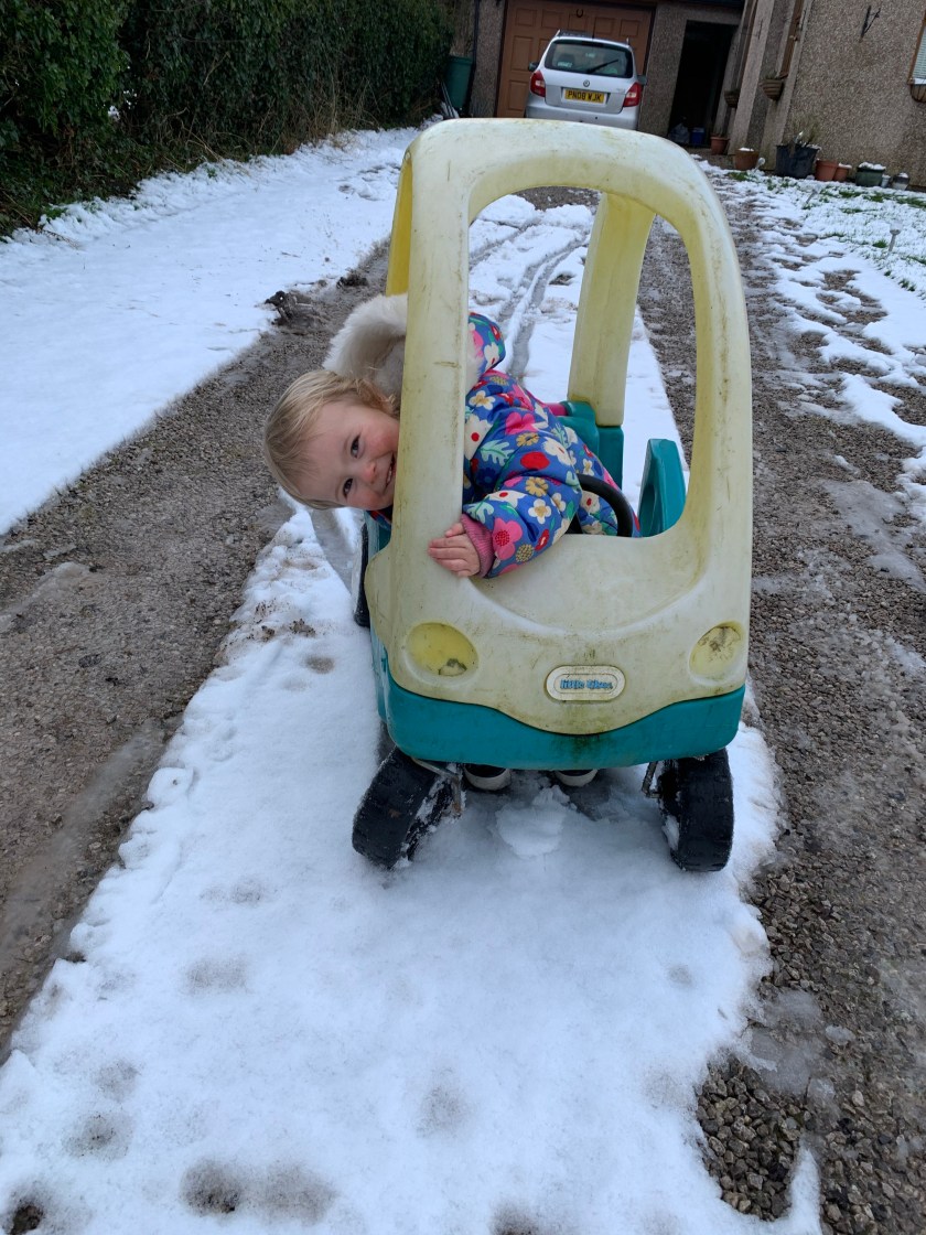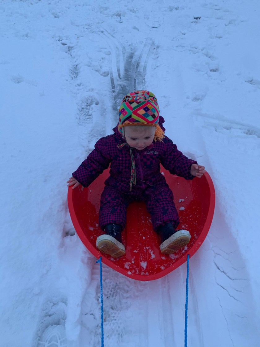 Evie’s first time on a sledge (she refuses gloves). Not sure at first but then she loves is and soon it’s more more and wheeeeee. So that’s good news!