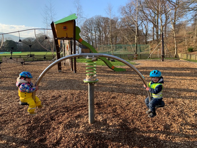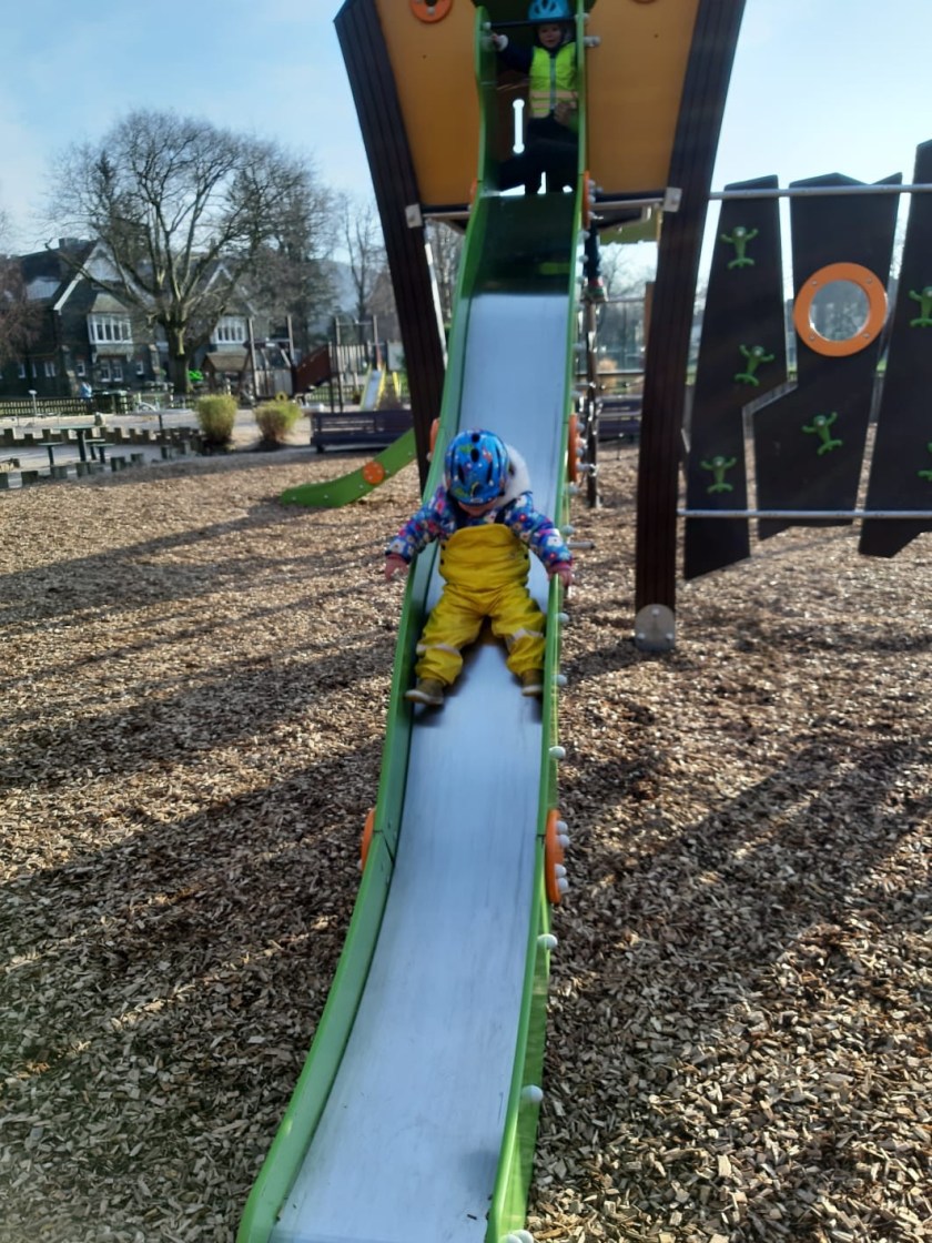 More important to them is the park, where they master the rope club to get up to the middle slide…. …..which nowadays is far more exciting than the small slide!