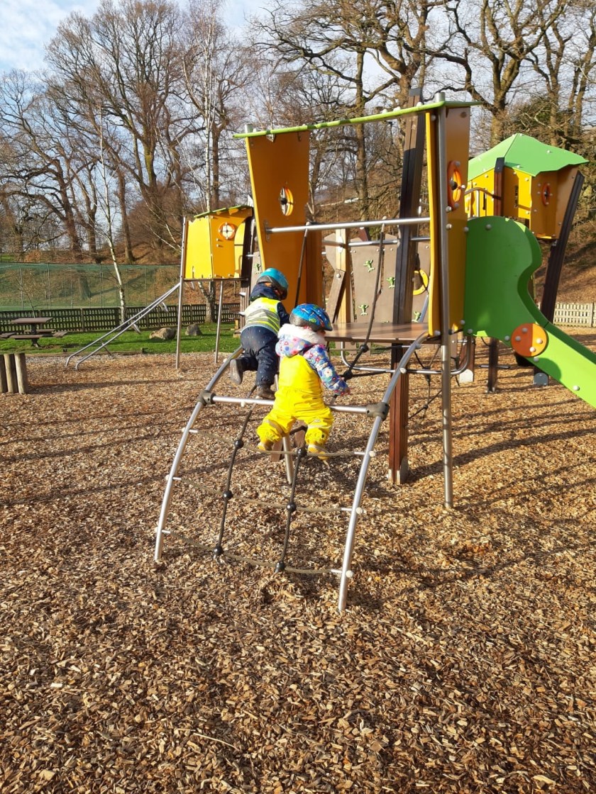 More important to them is the park, where they master the rope club to get up to the middle slide…. …..which nowadays is far more exciting than the small slide!