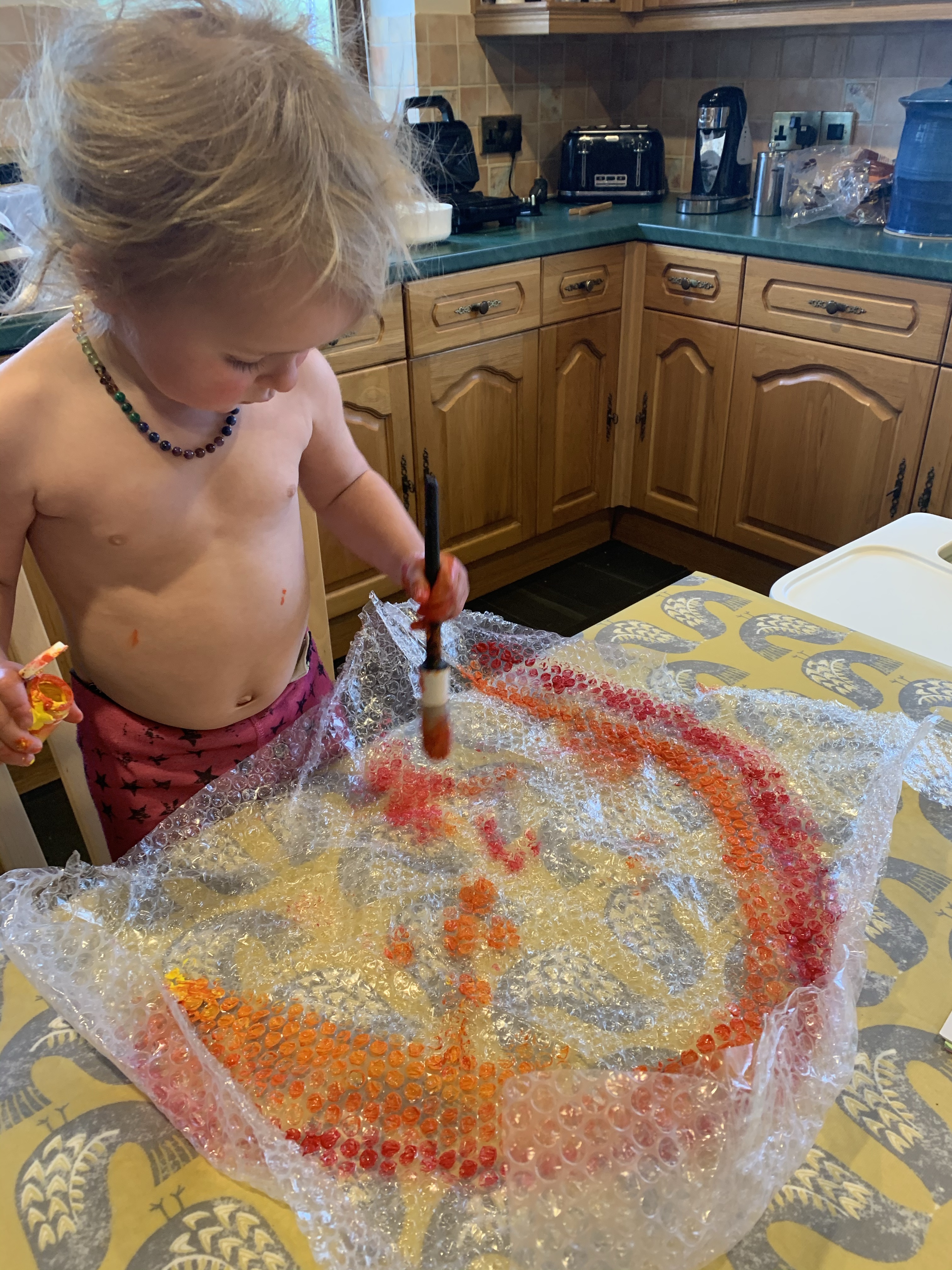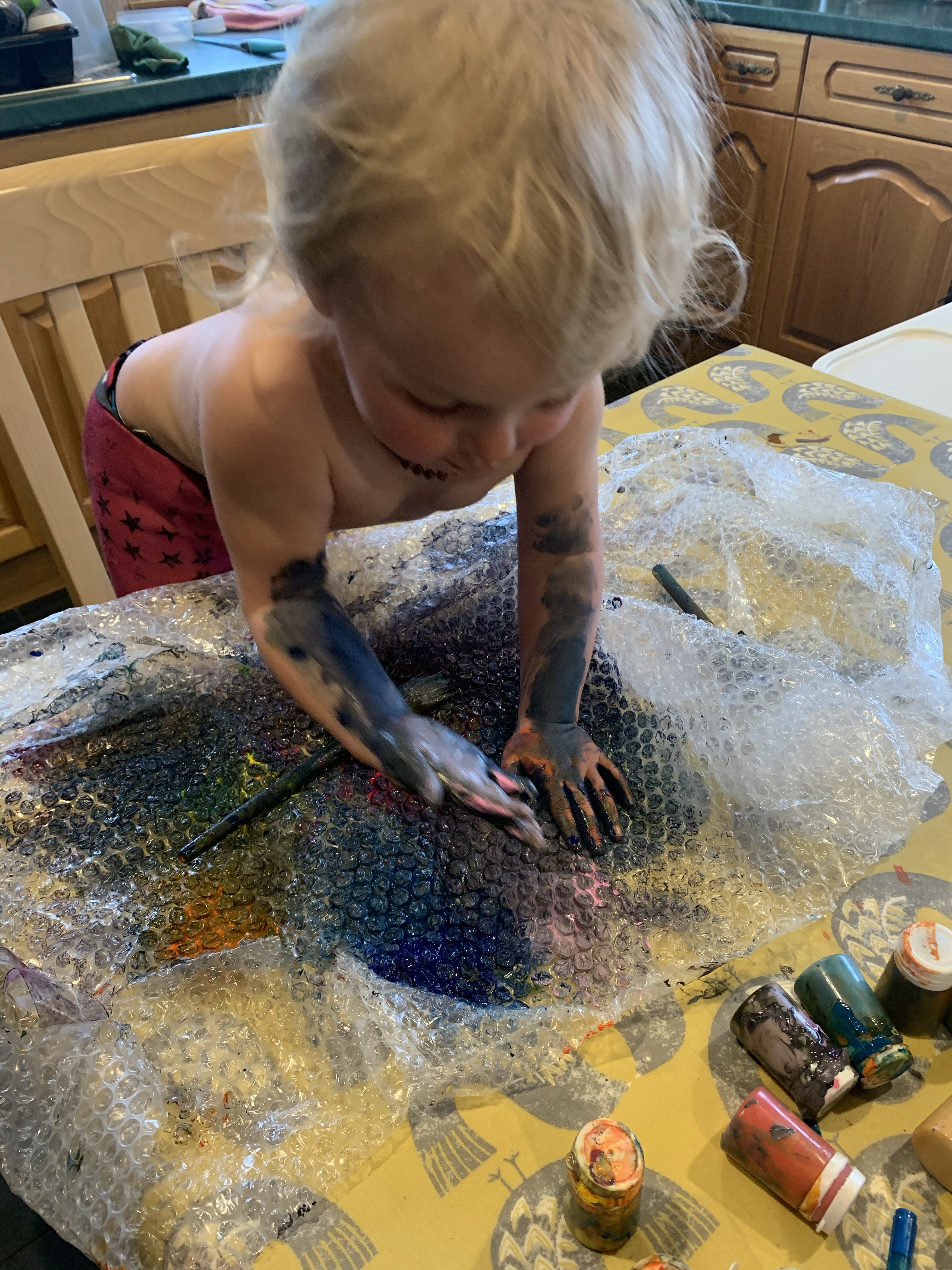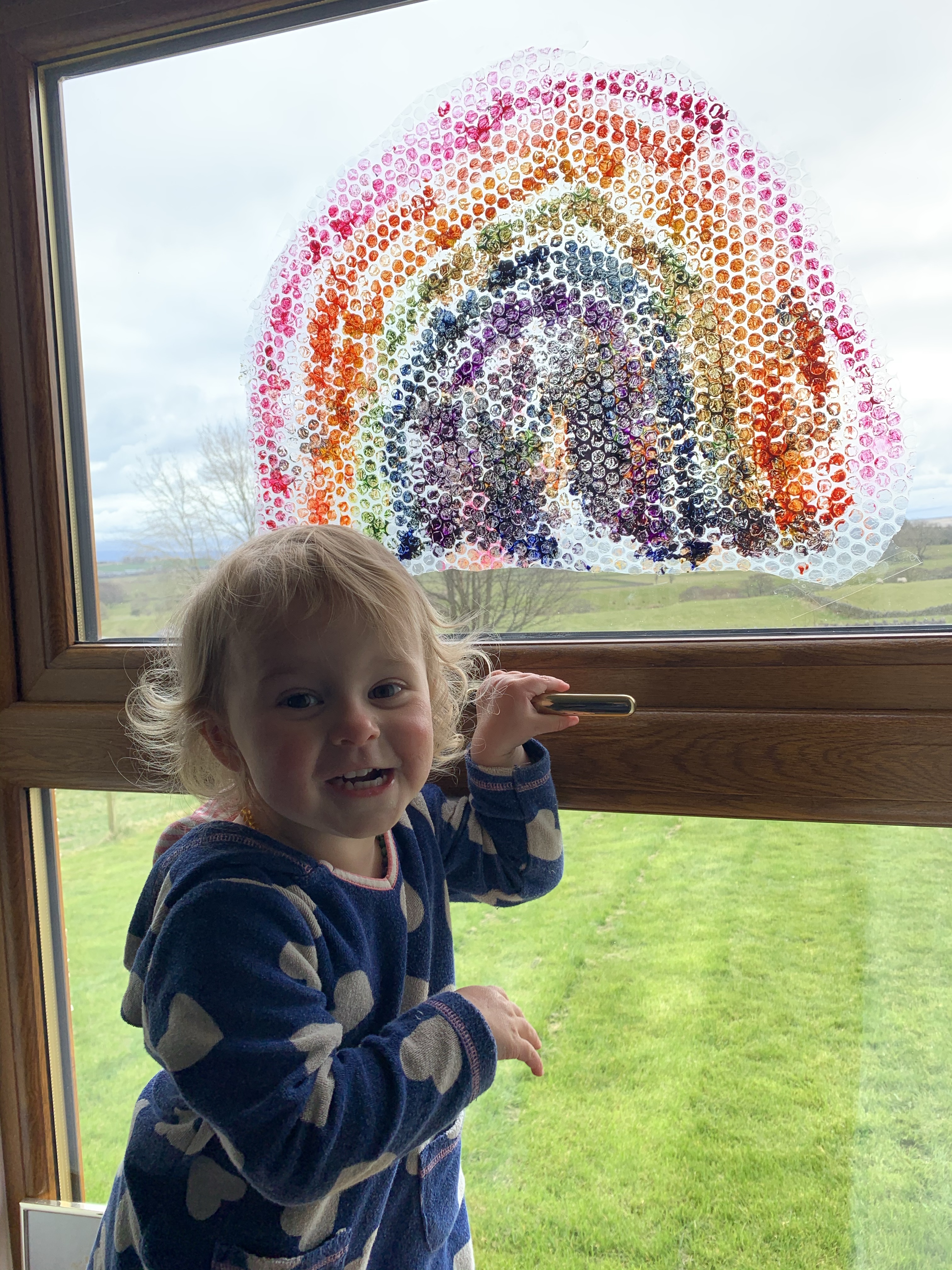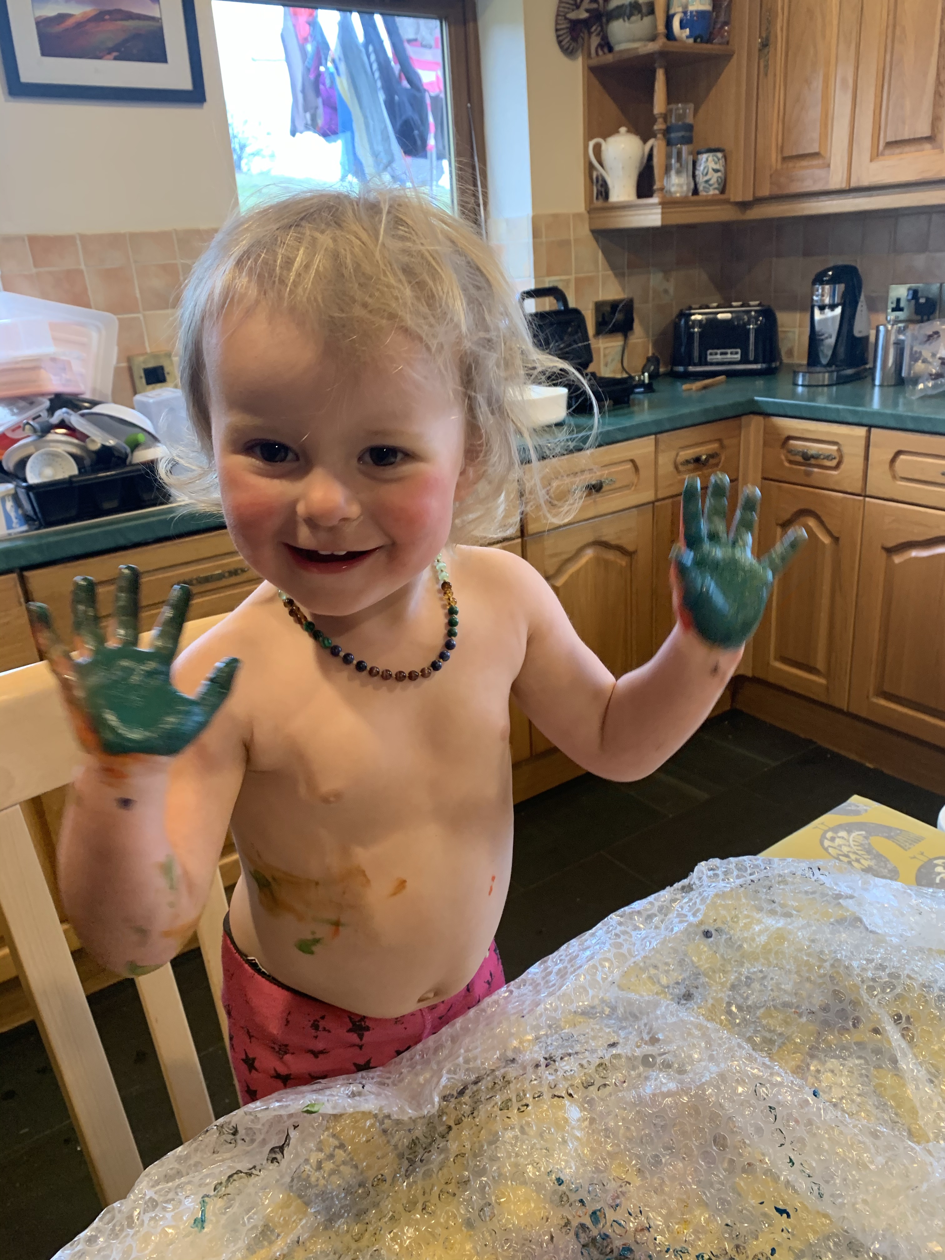 Doing art We spent quite a bit of time painting various things to make cards to send to people that we couldn’t see. Although the projects often started and finished well, there was often a painted Evie as a consequence as well! Thankfully only once a painted house to! Evie remains very proud of her rainbow!