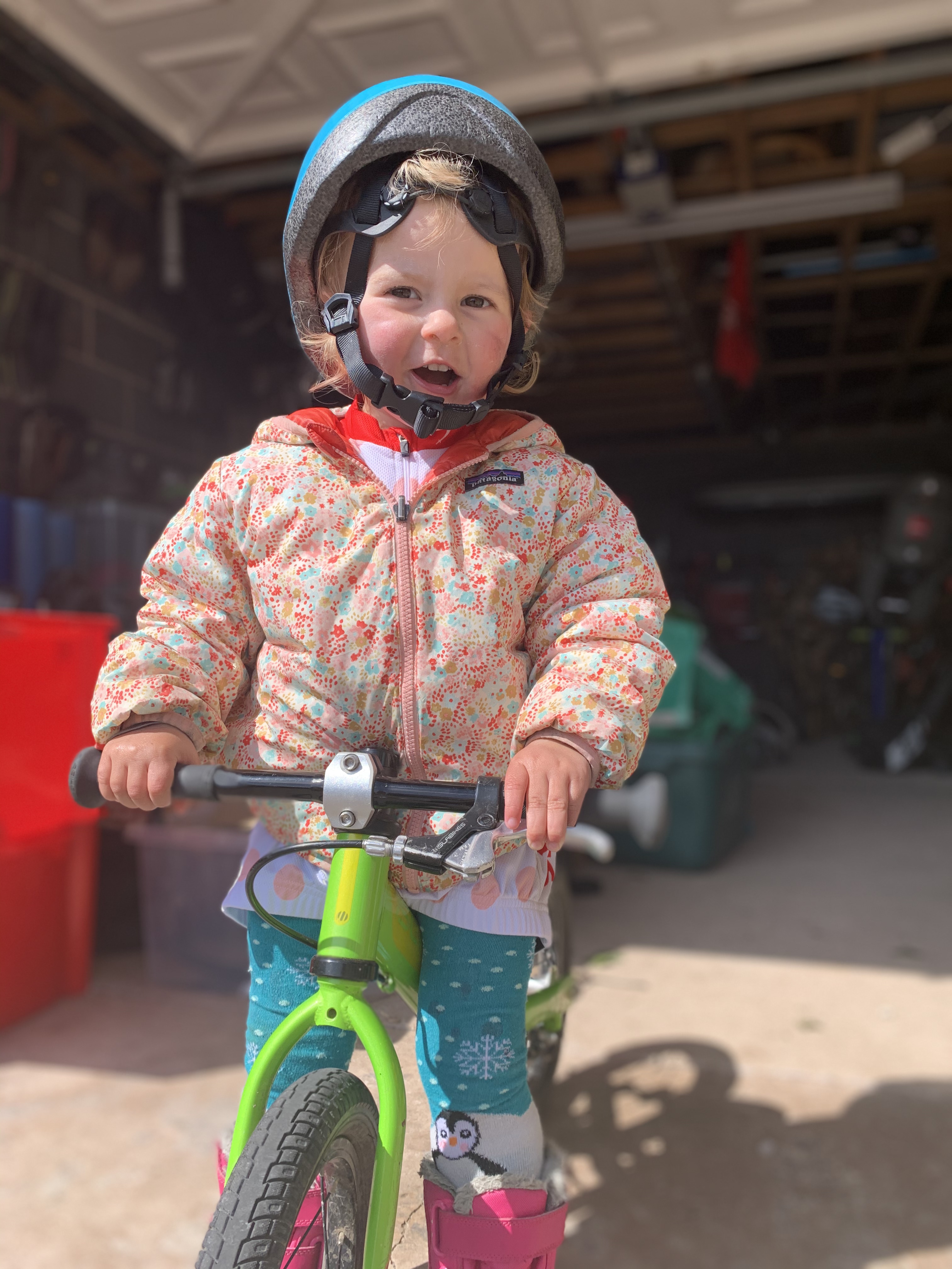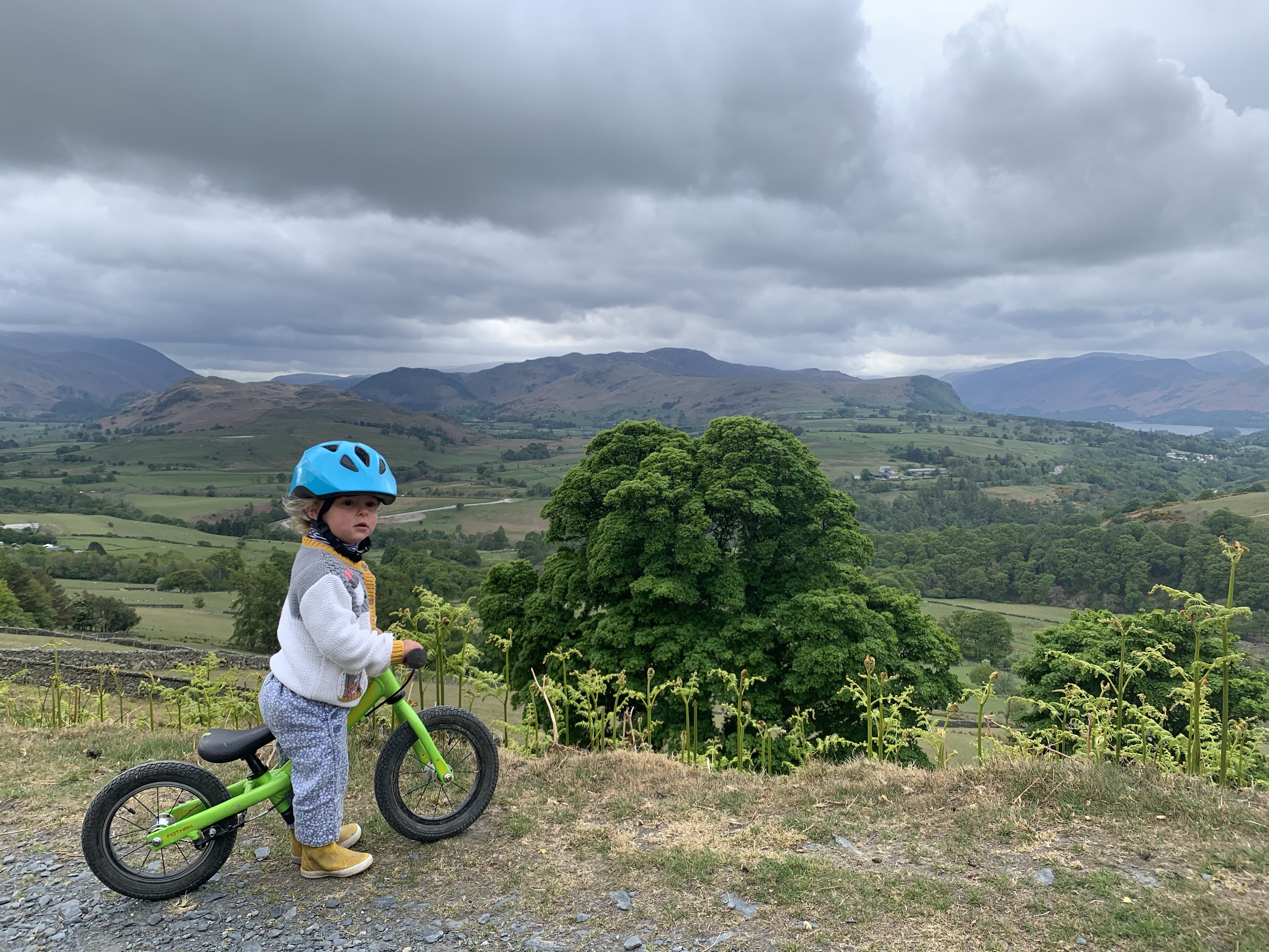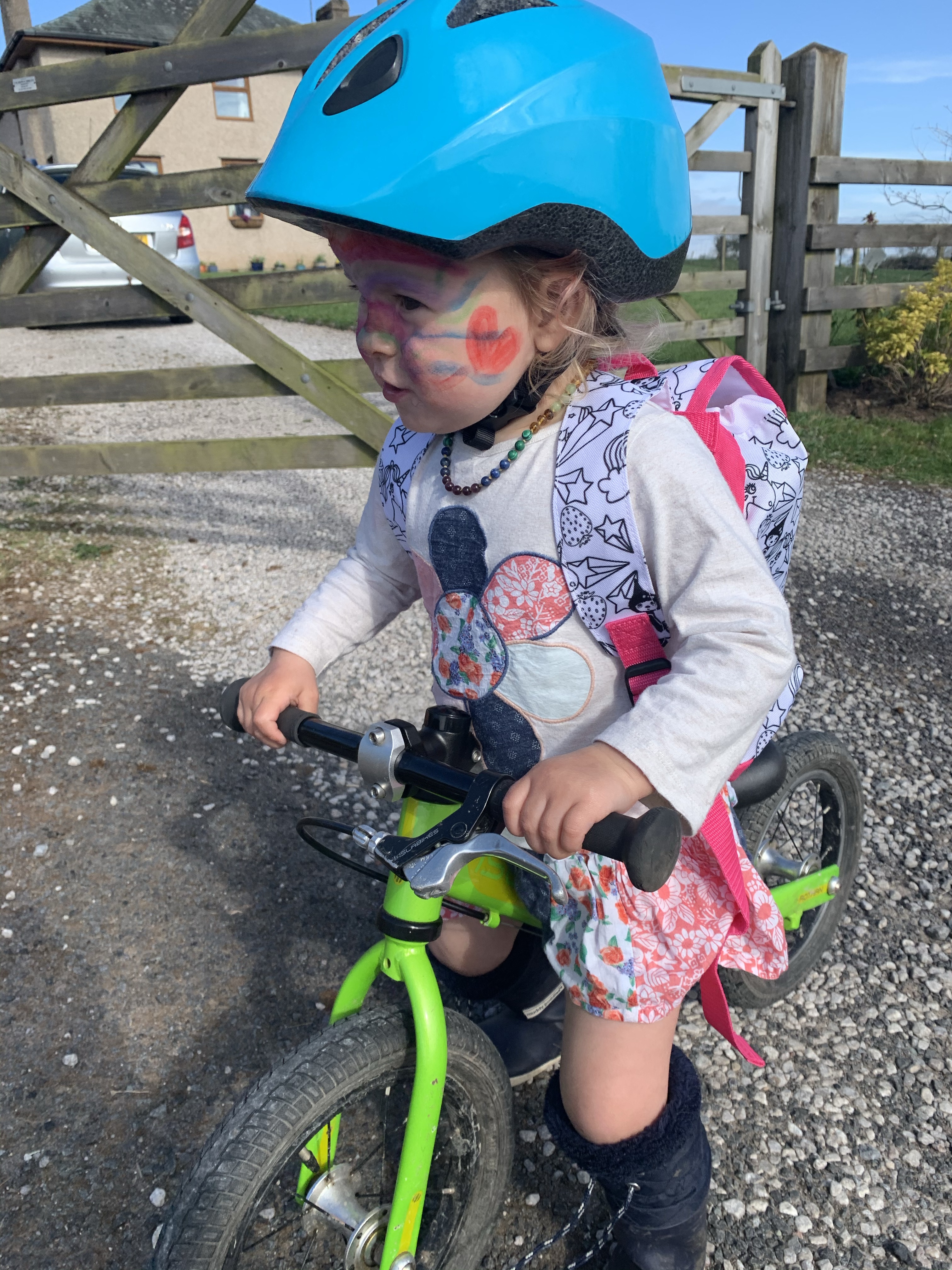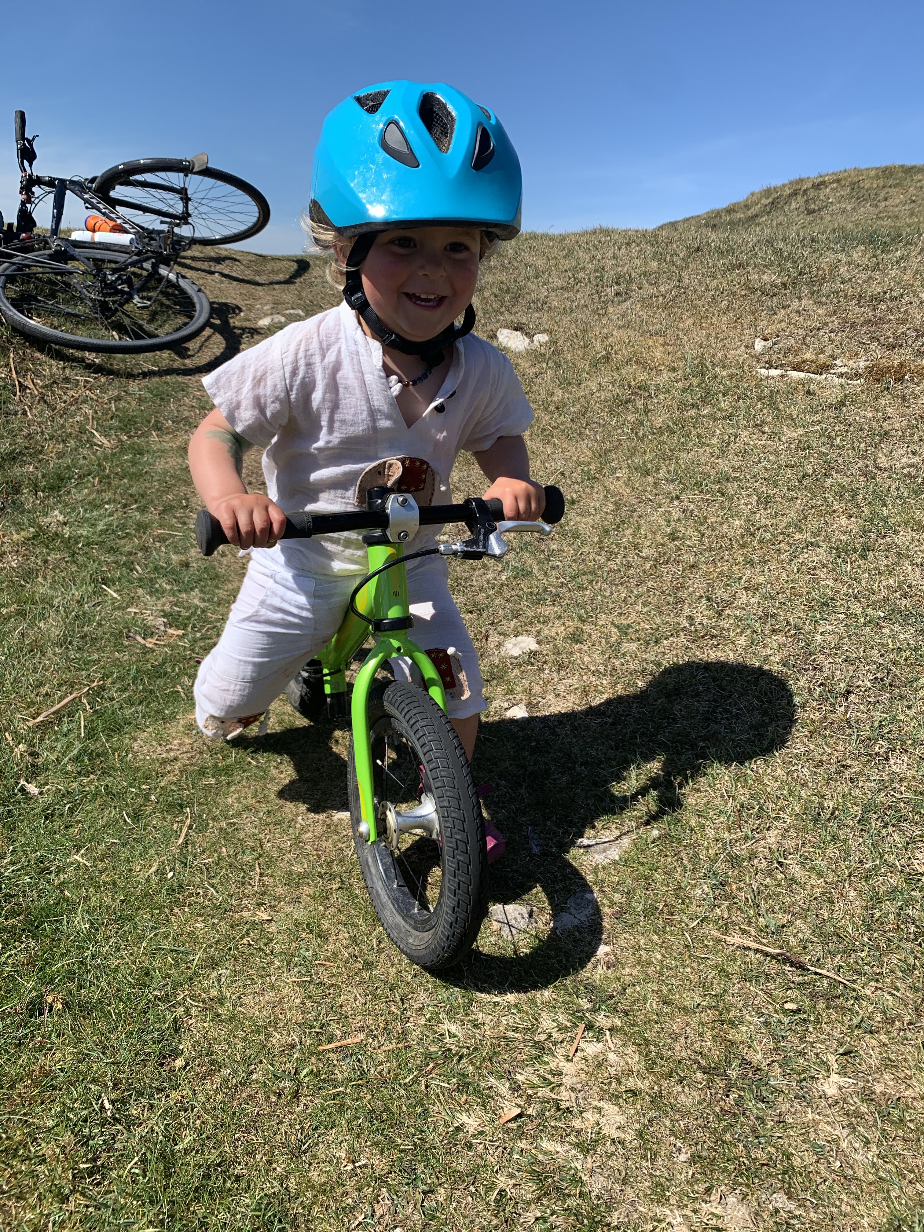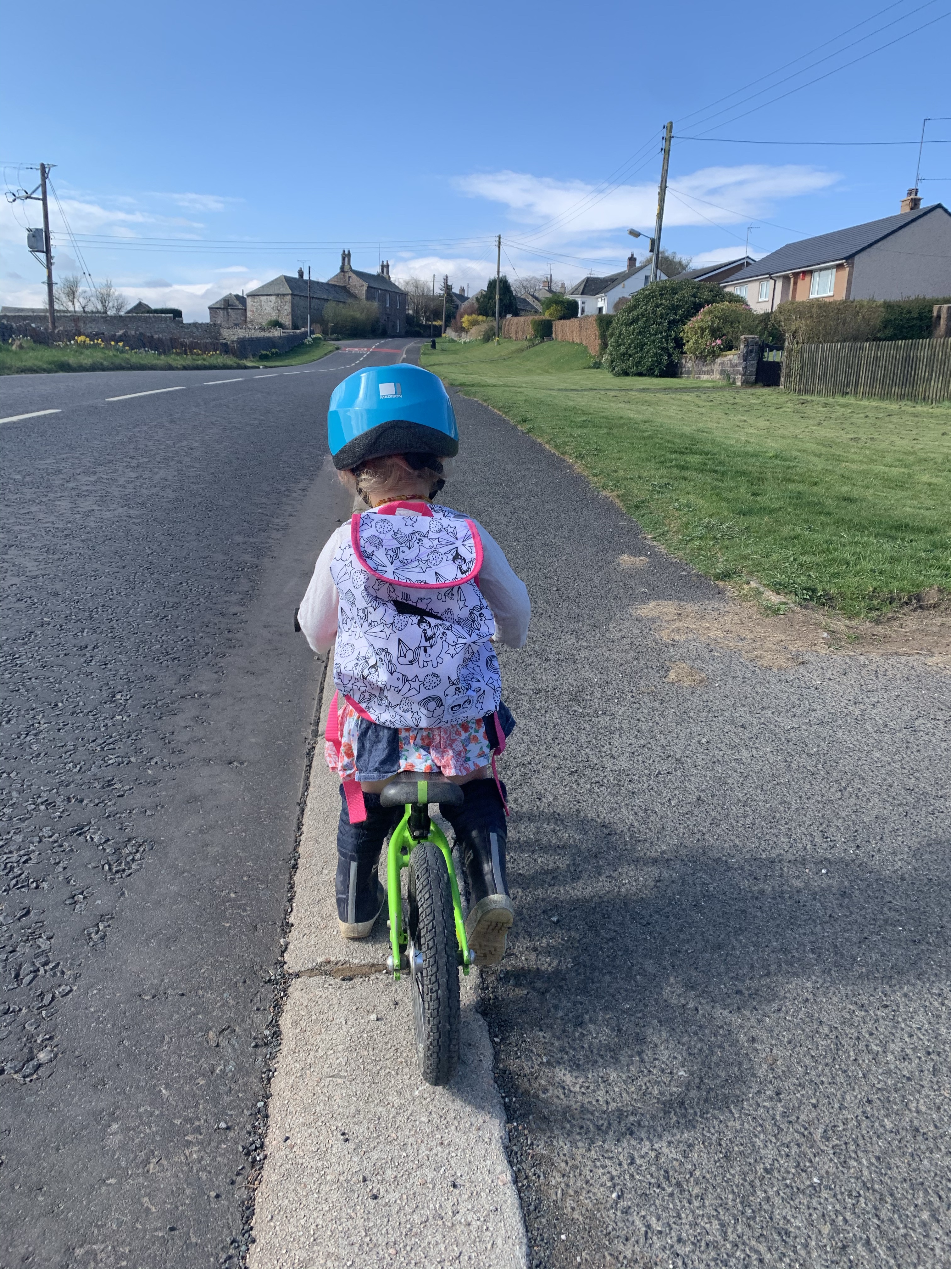Learning to ride the balance bike Early on in lockdown we spent a lot of time on the ‘bumpy track’ where Evie got the hang of lifting her feet up and learning to do big ‘weeeeeee’s’. It was a great time to learn, when no-one was driving their cars, especially the time when she continued out of the bumpy track and straight down the middle of the road!! As we were allowed to start visiting places in the car Evie’s bike rides got more adventurous…. and so they continue.