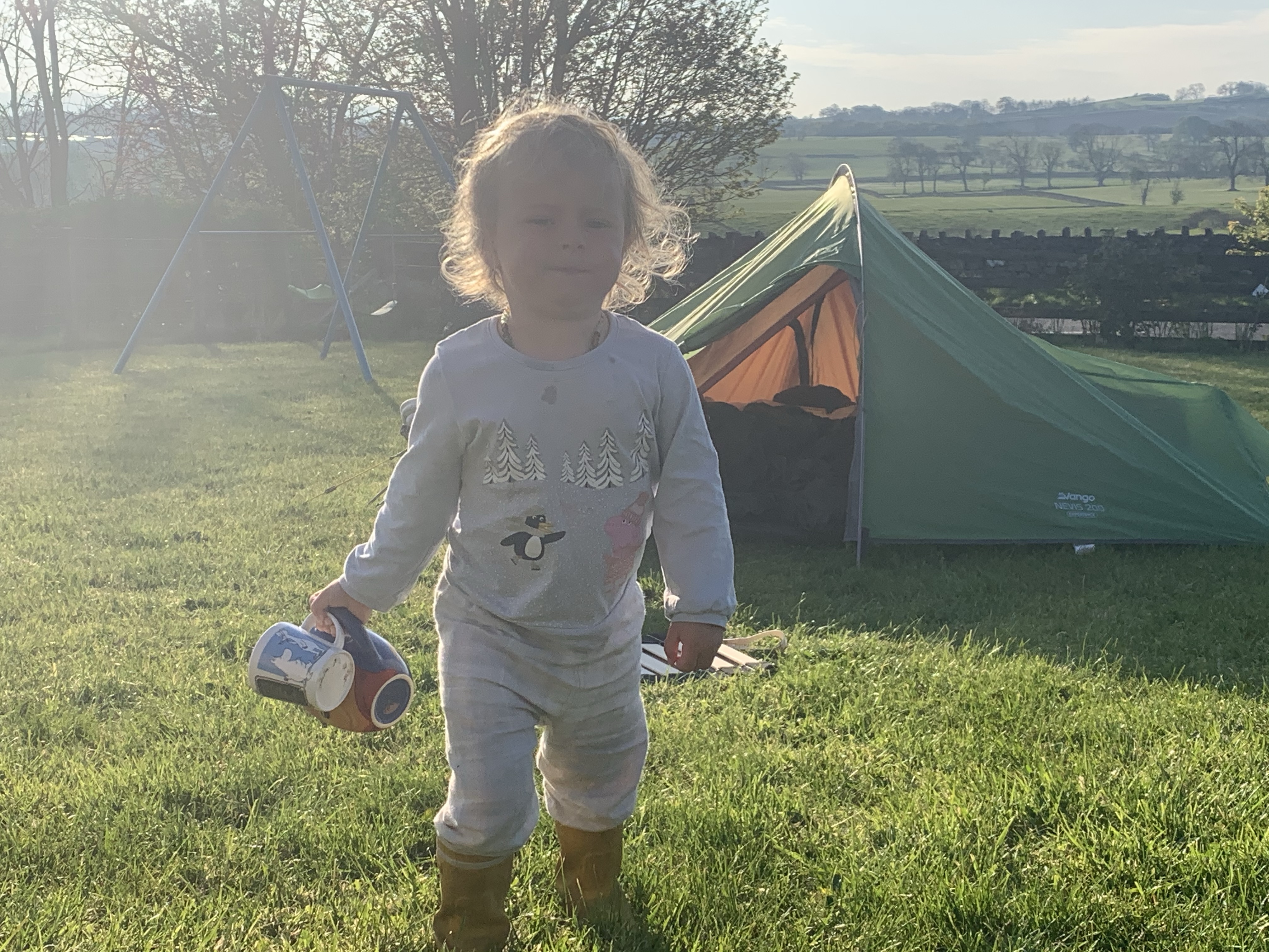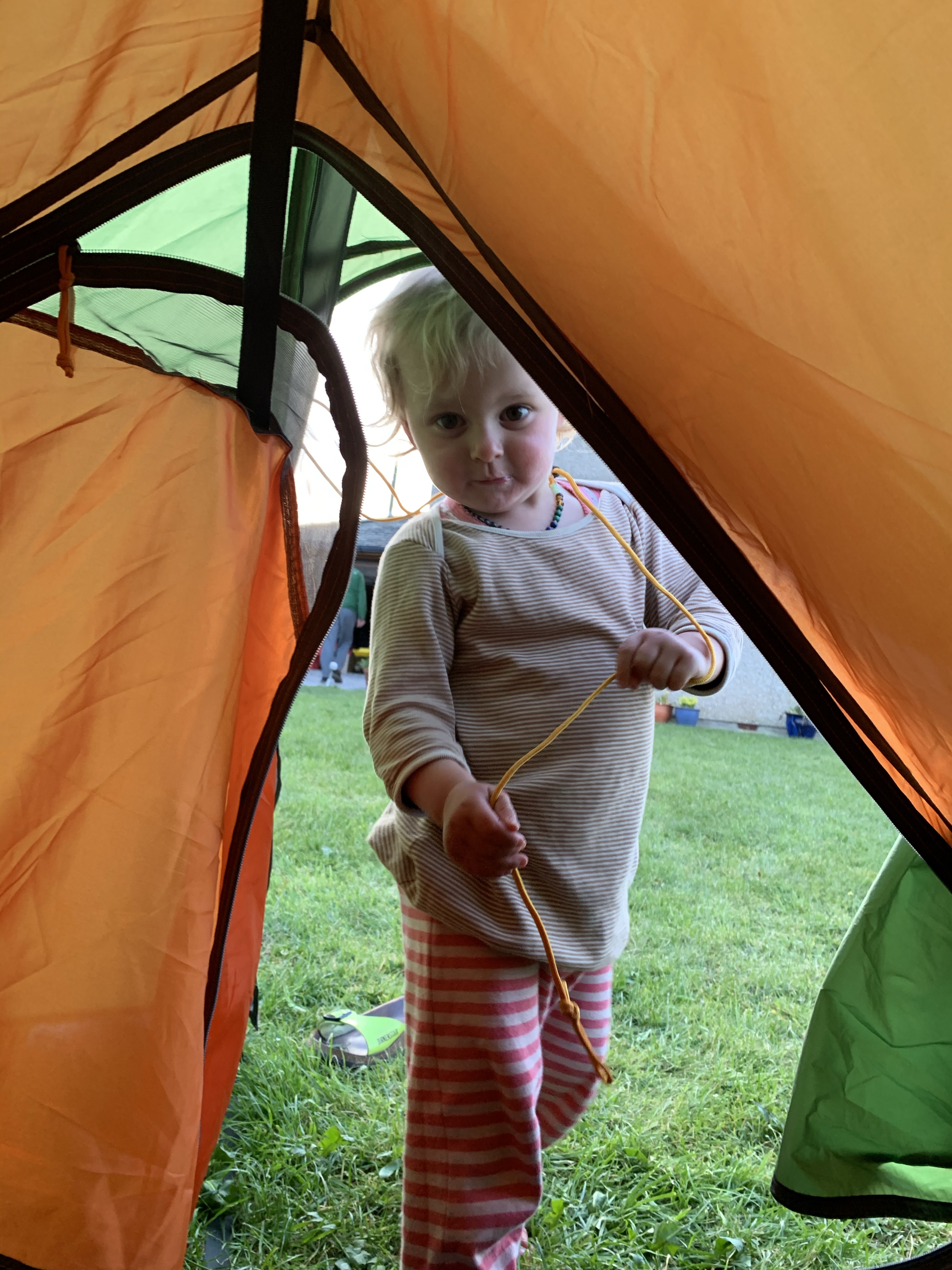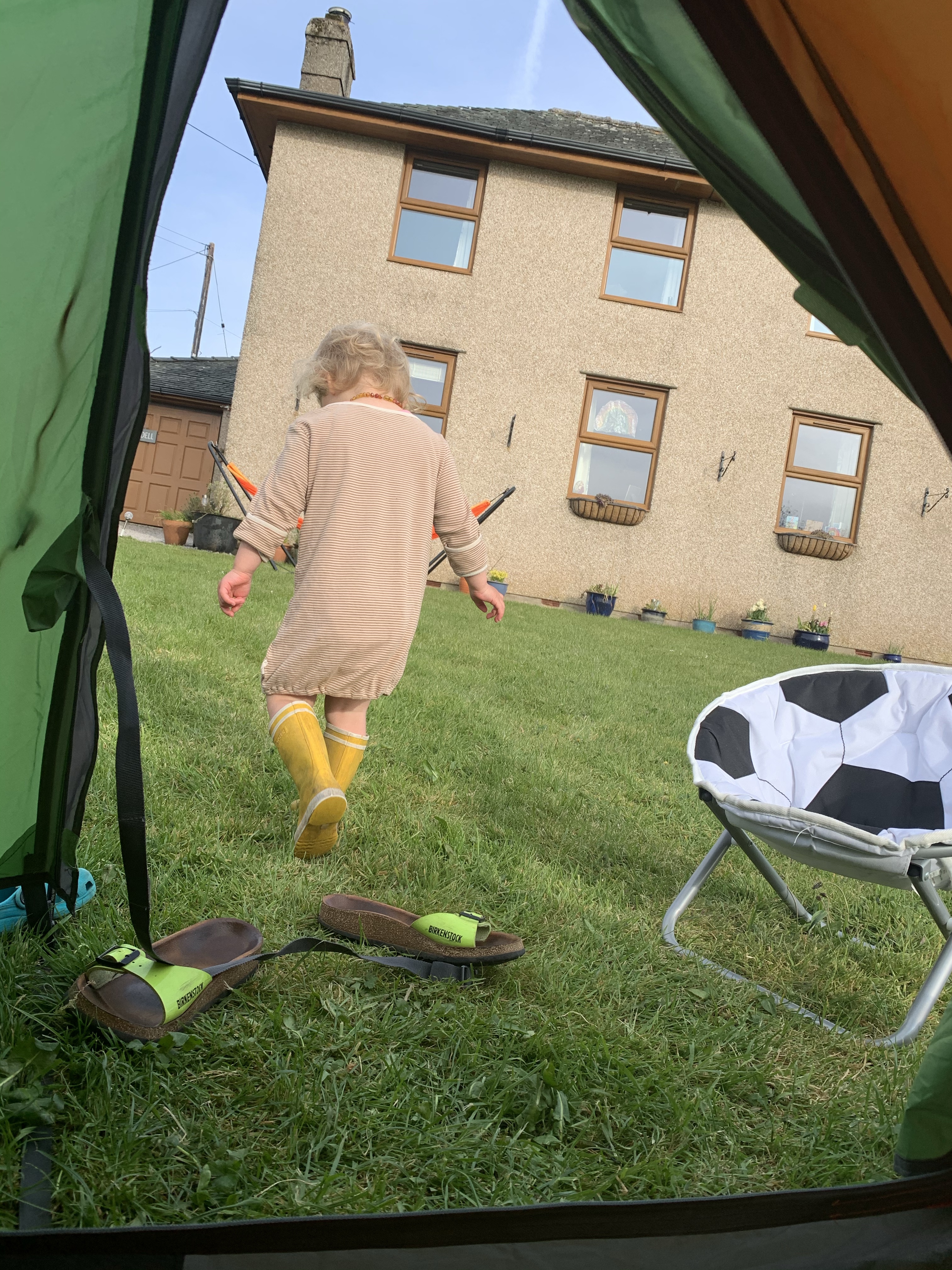 Camping in the garden Having just bought a new tent we decided to put it up. Mainly for something else to play with in the garden, ‘sleeping’, having tea parties, but also to have some nighttime adventures sleeping in the garden. It sometimes felt like being at a festival the next morning!!