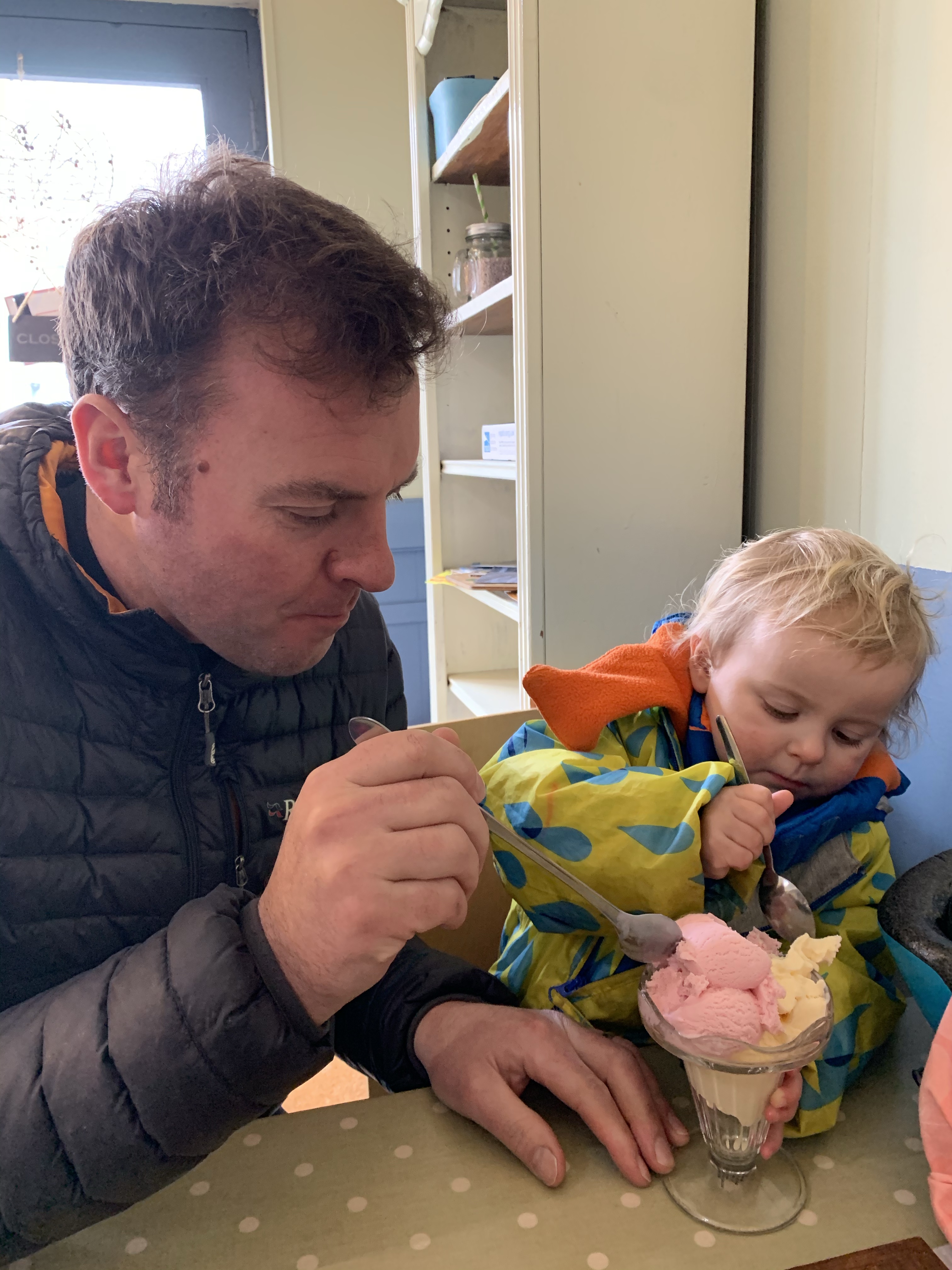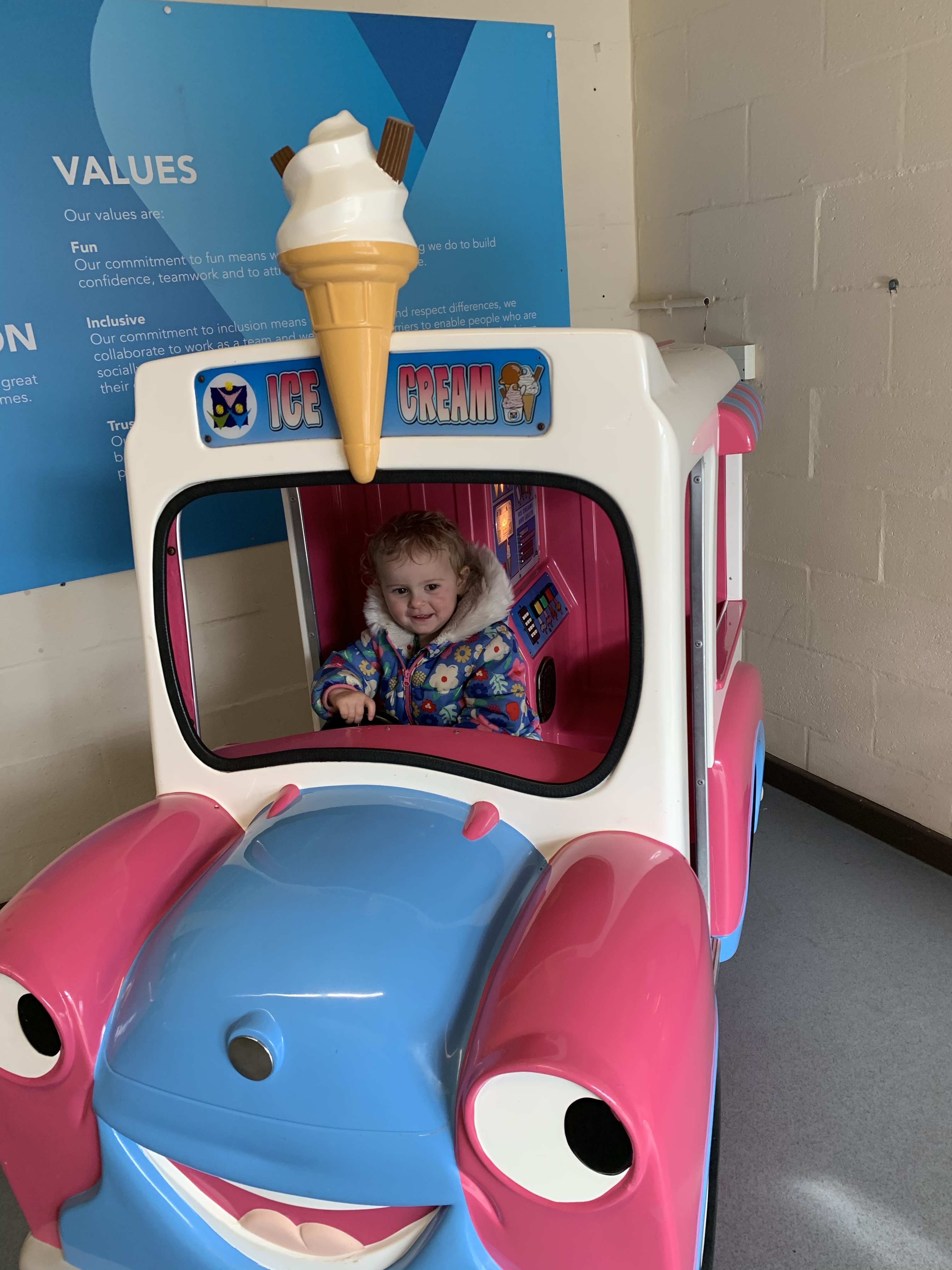 After a swim in the fun session at the pool in Berwick-upon-Tweed (apparently the best pool around), Evie is in her element driving her very own ice-cream van! We struggle to get her to leave it behind….
