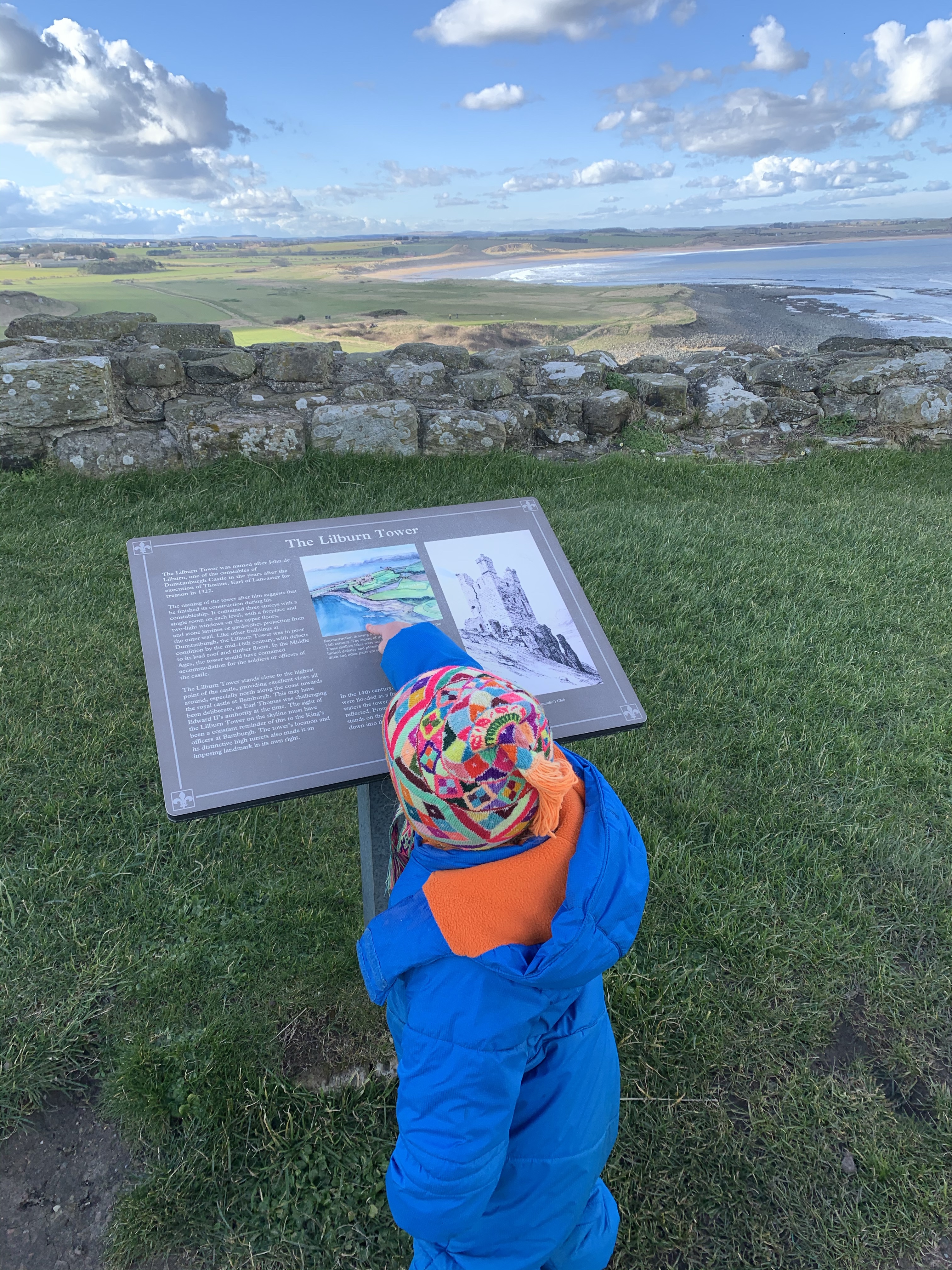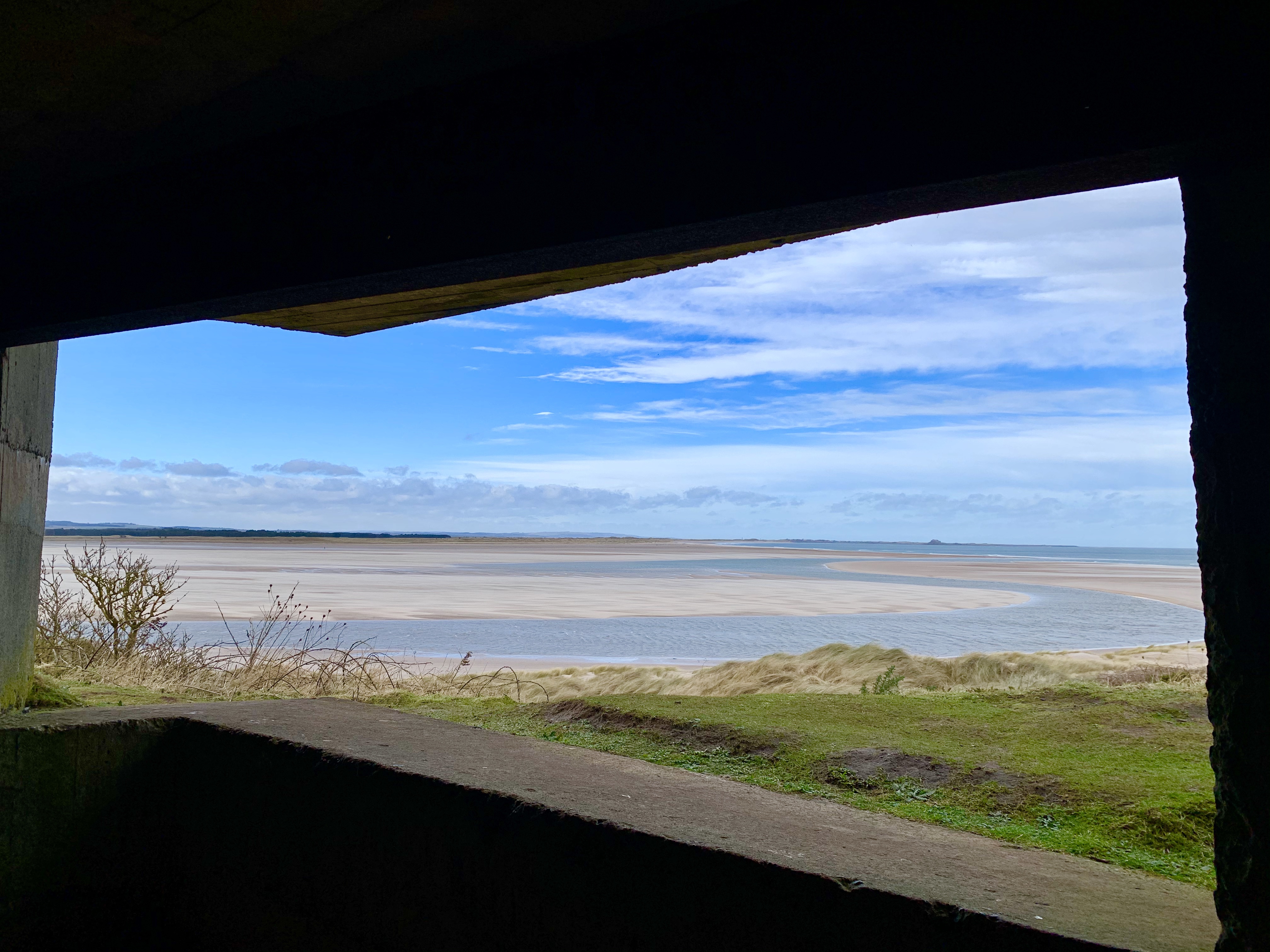 Walking across Bamburgh golf course the wind continued to blow hard and Evie wasn’t so sure. She was very happy when we came across this old (I think) war bunker, which housed an astounding view.