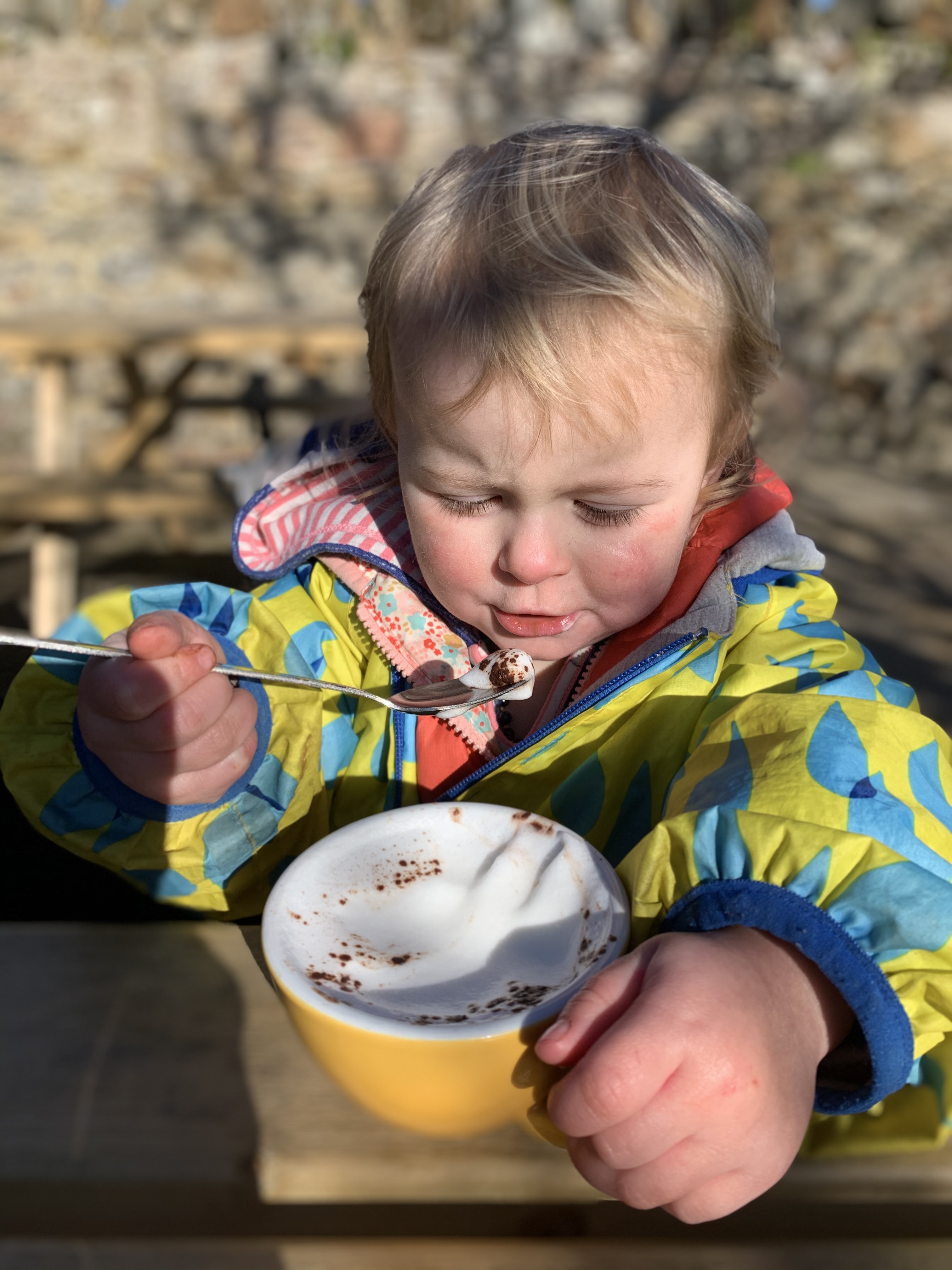 But it looks a long way so we decide on a coffee at Pilgrims coffee shop (where they roast their own beans) and Evie is excited to get a Babychino, to fuel us for our walk.