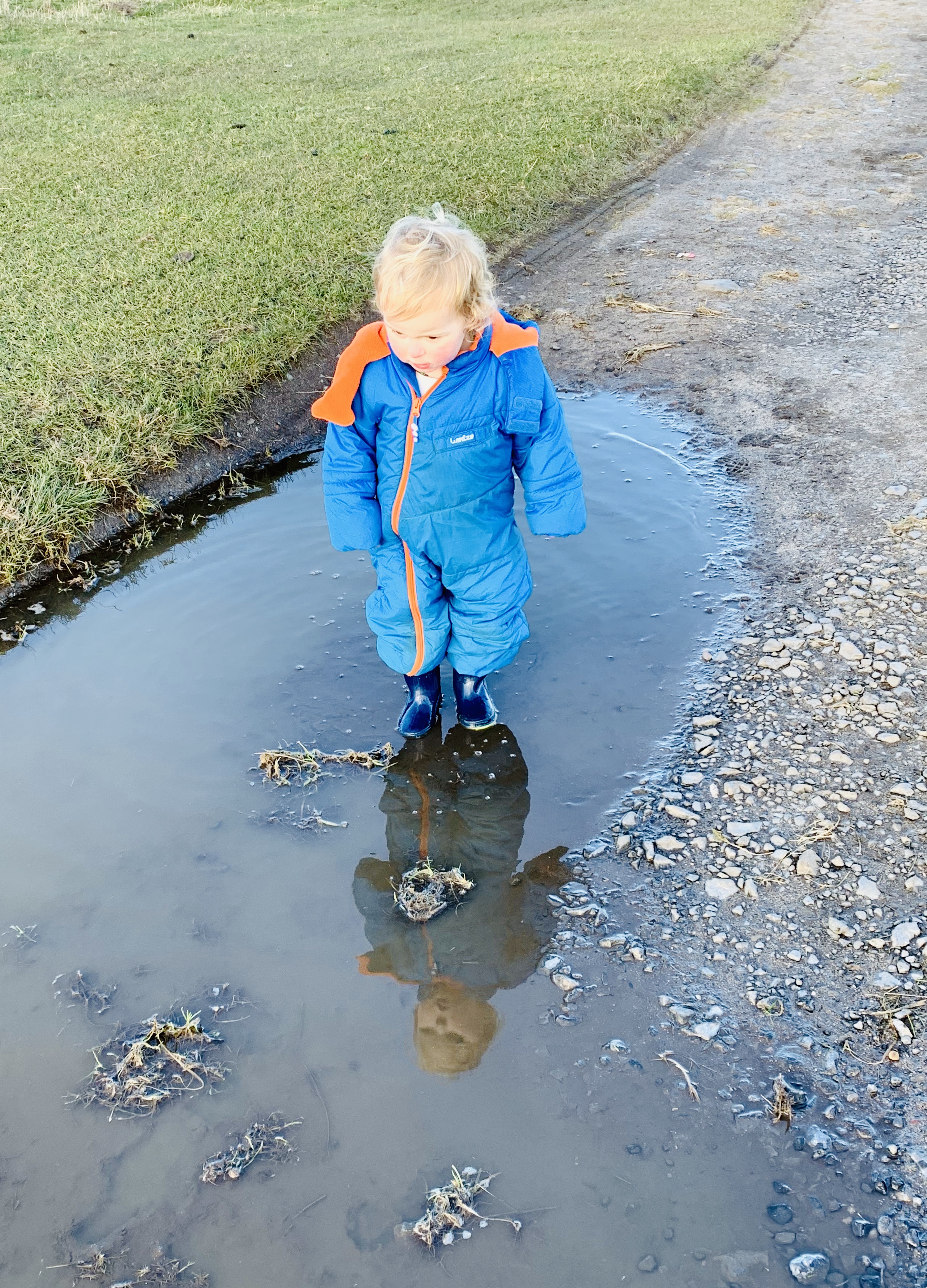 Evie enjoys the puddles – of course. And then gets upset at the fact that she gets a wet foot!!