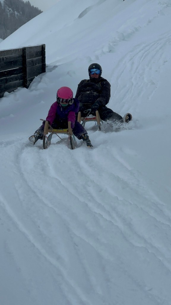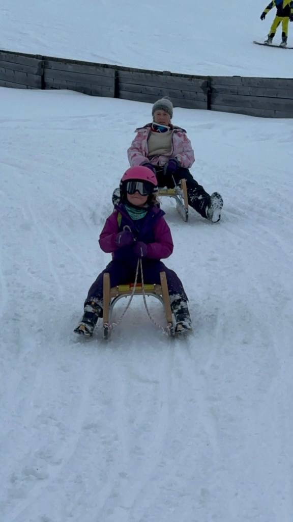 Tobogganing was something else that we did. Great fun as Grandma could join in, and also a great activity for keeping the smiles on faces the morning when there was a complete white out.
