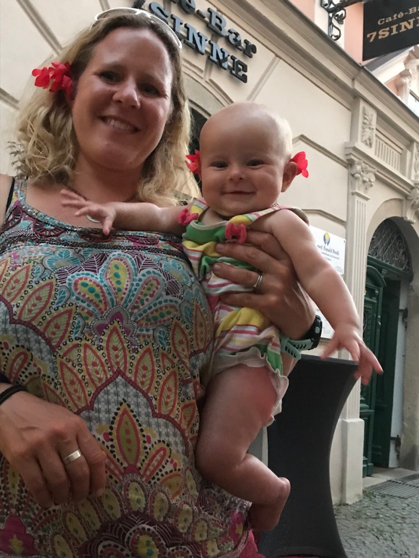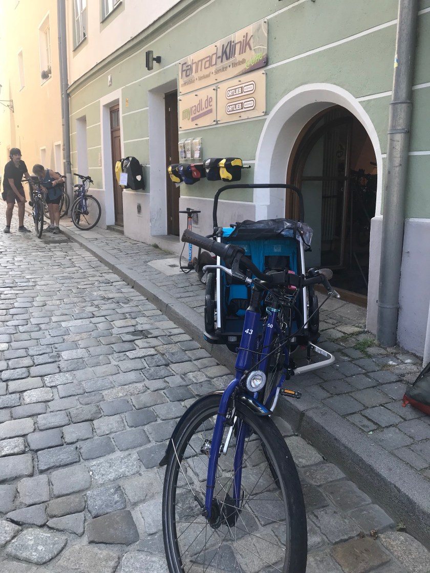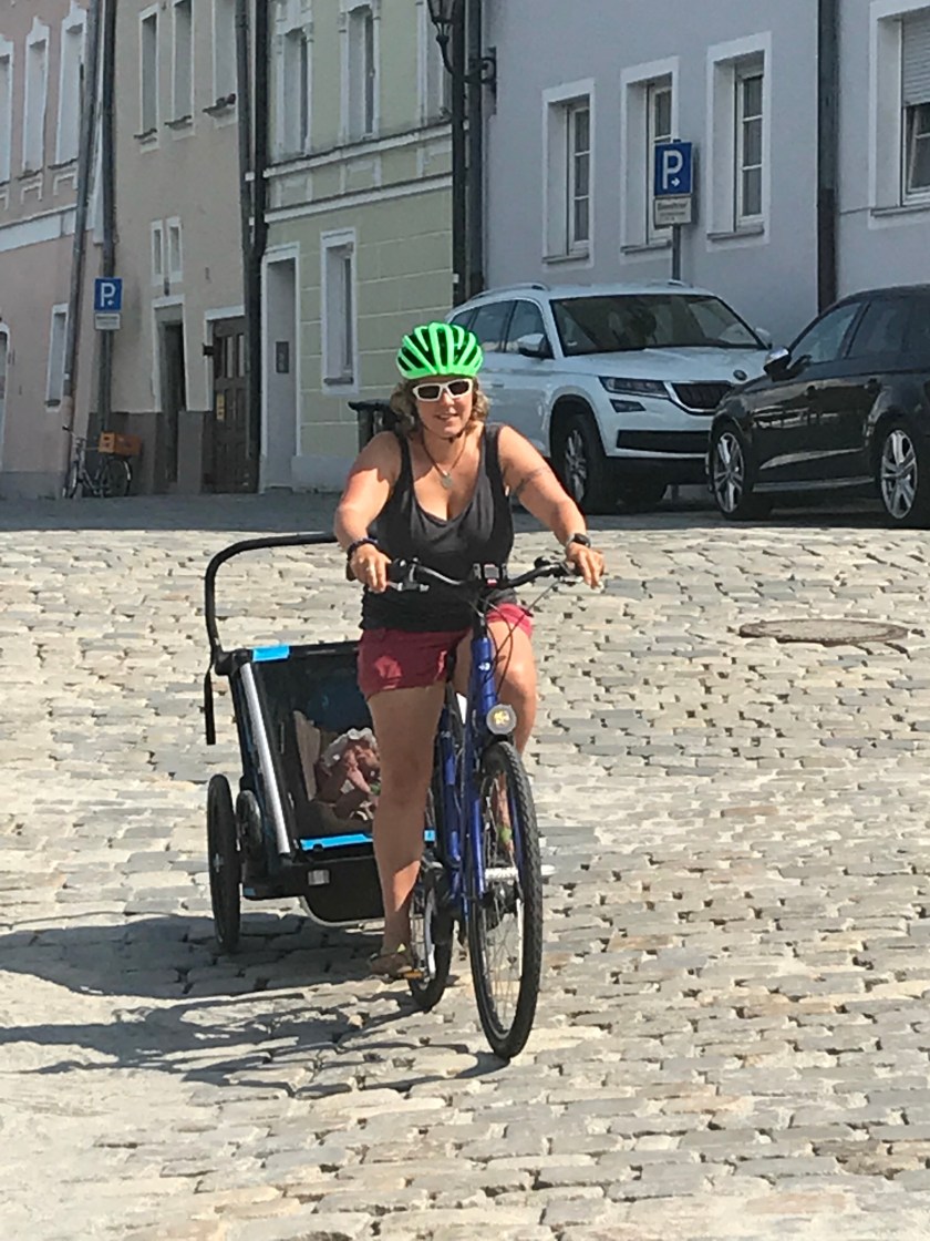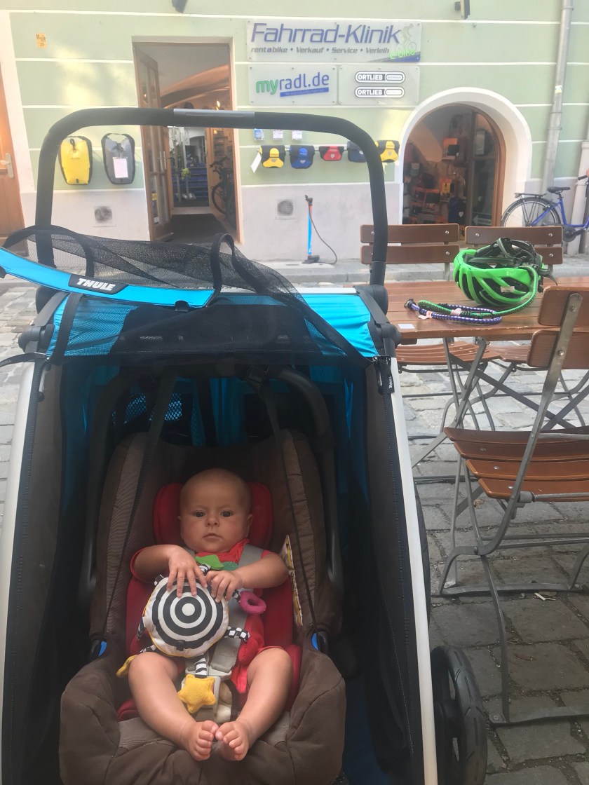 This Chariot is quite different to the one back home, so it took quite a bit of fettling and two attempts to get the car seat in a position and stable enough that I was happy with. Good job there was a cafe next to the bike shop!