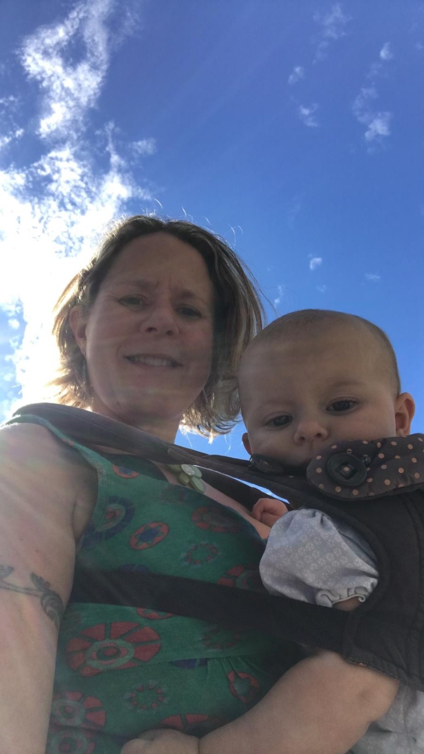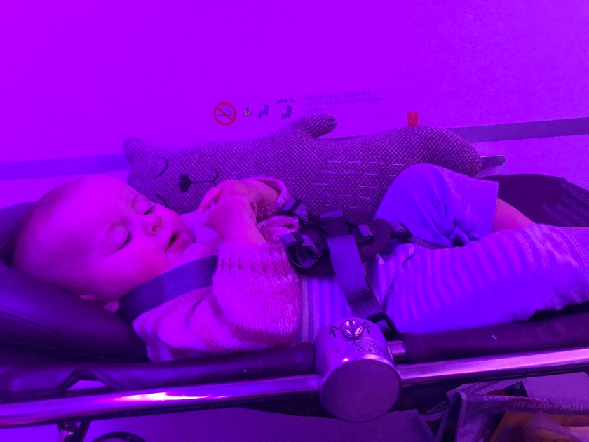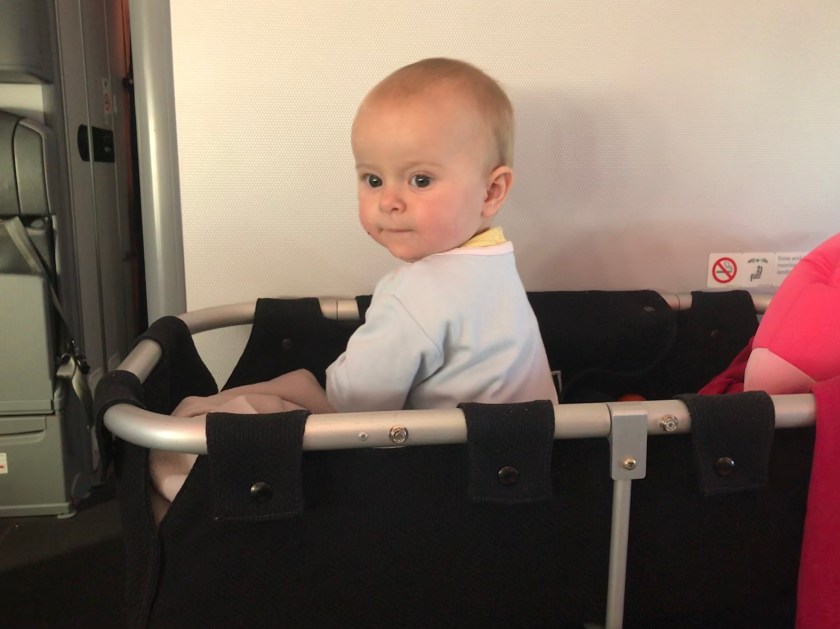 On the plane and Evie has the option to fly in luxury on a basonette…. or she could instist on sleeping on one of us most of the way instead.