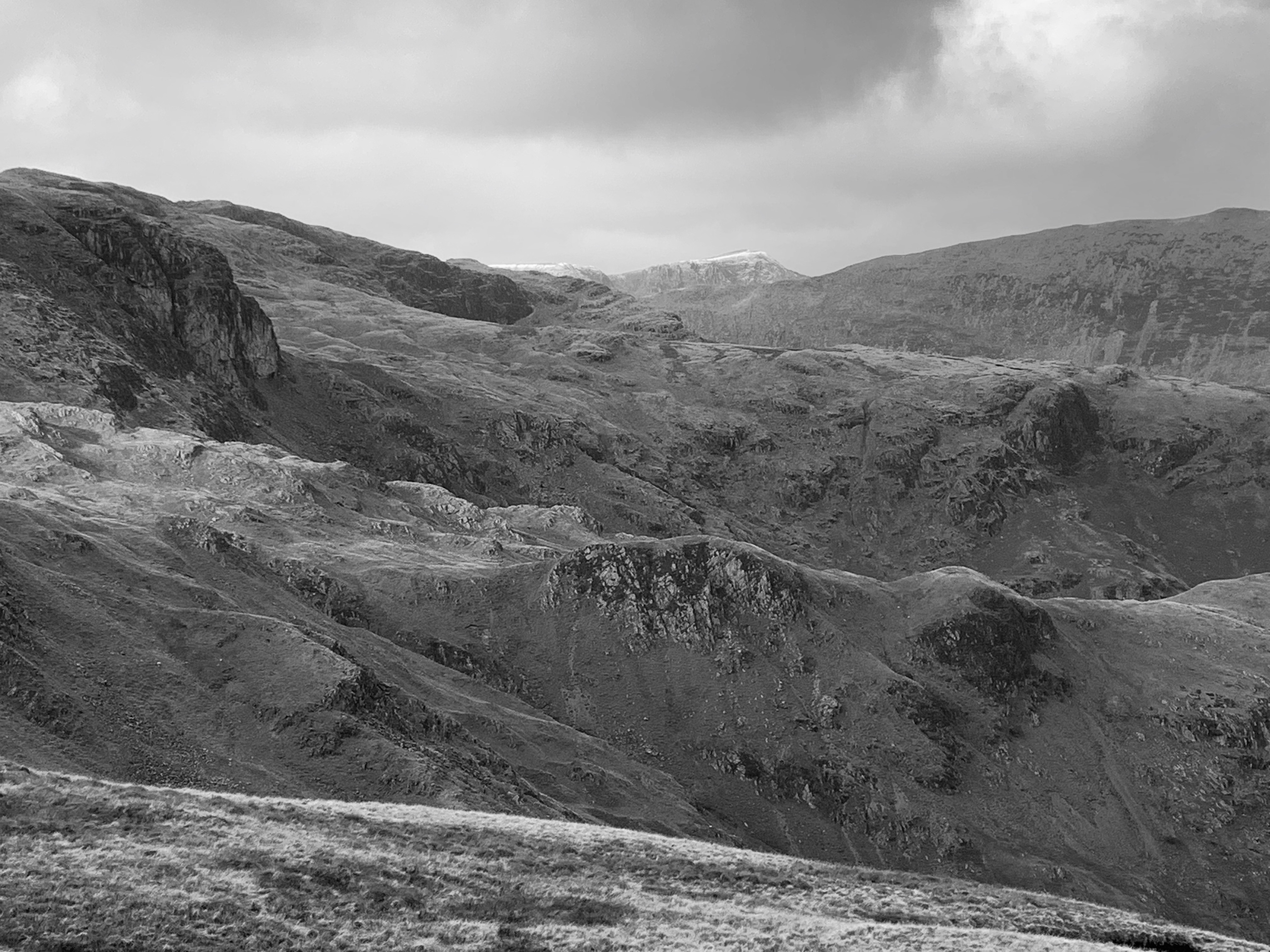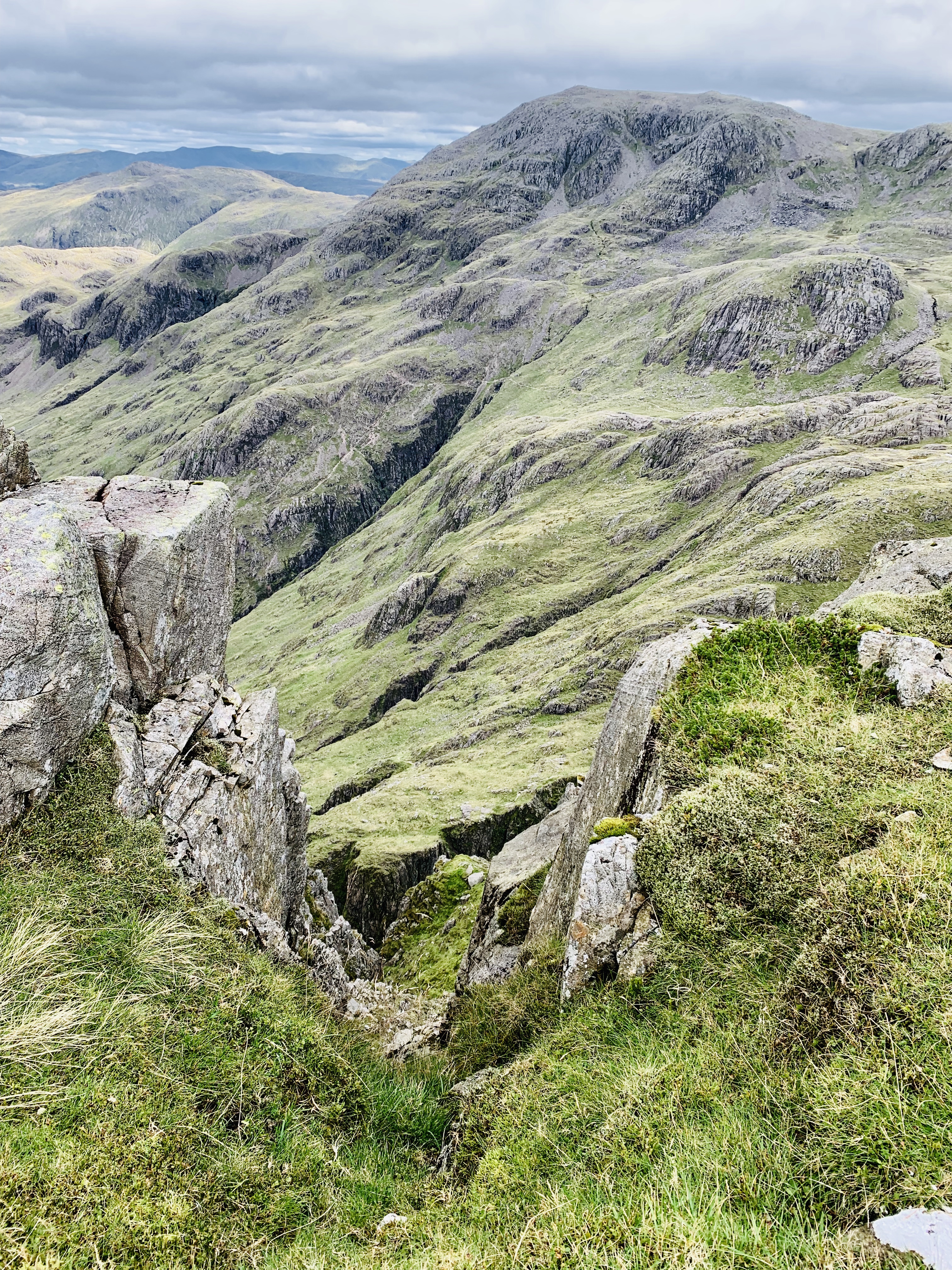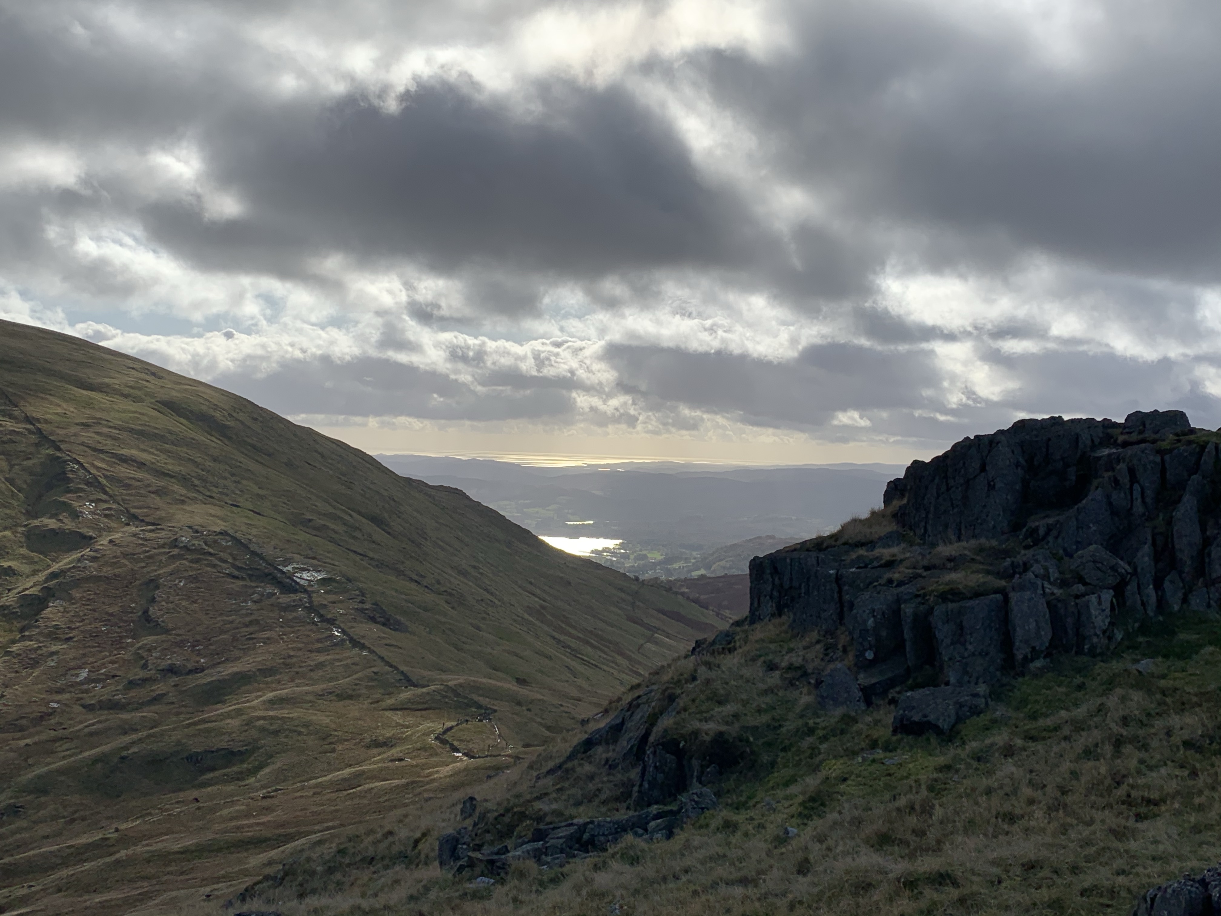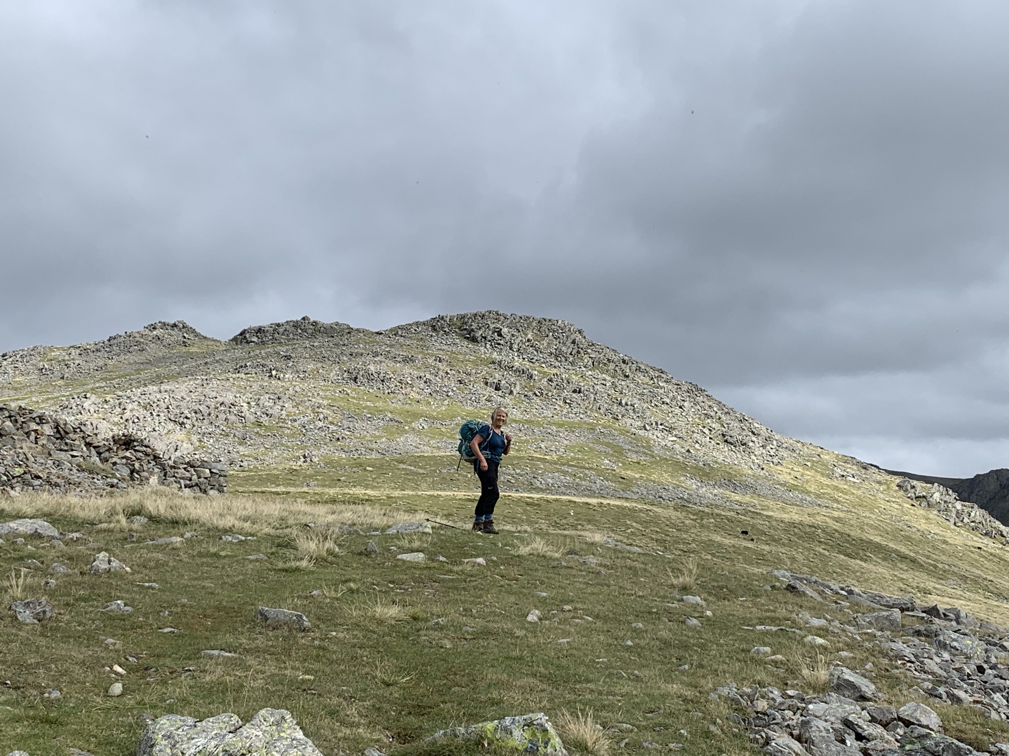 On a grey day but high enough to see the tops, with Sally to join us , we finally decided on these lower Wainwright’s with a variety of route options to have a go at today. A steep climb up the nose of High Hartsop Dodd brought us to these fantastic views through the rocks.